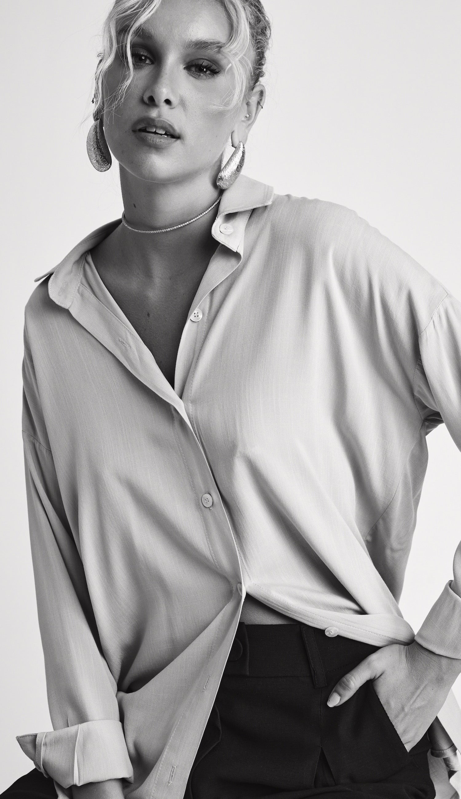 Camisa confeccionada em viscose com toque e aspecto de linho. Possui modelagem ampla e alongada, mangas longas e fechamento frontal por botões madrepérola. Peça super versátil podendo ser amarrada em laço, usada solta, com uma parte para dentro da peça de baixo e outra para fora, como terceira peça, etc.