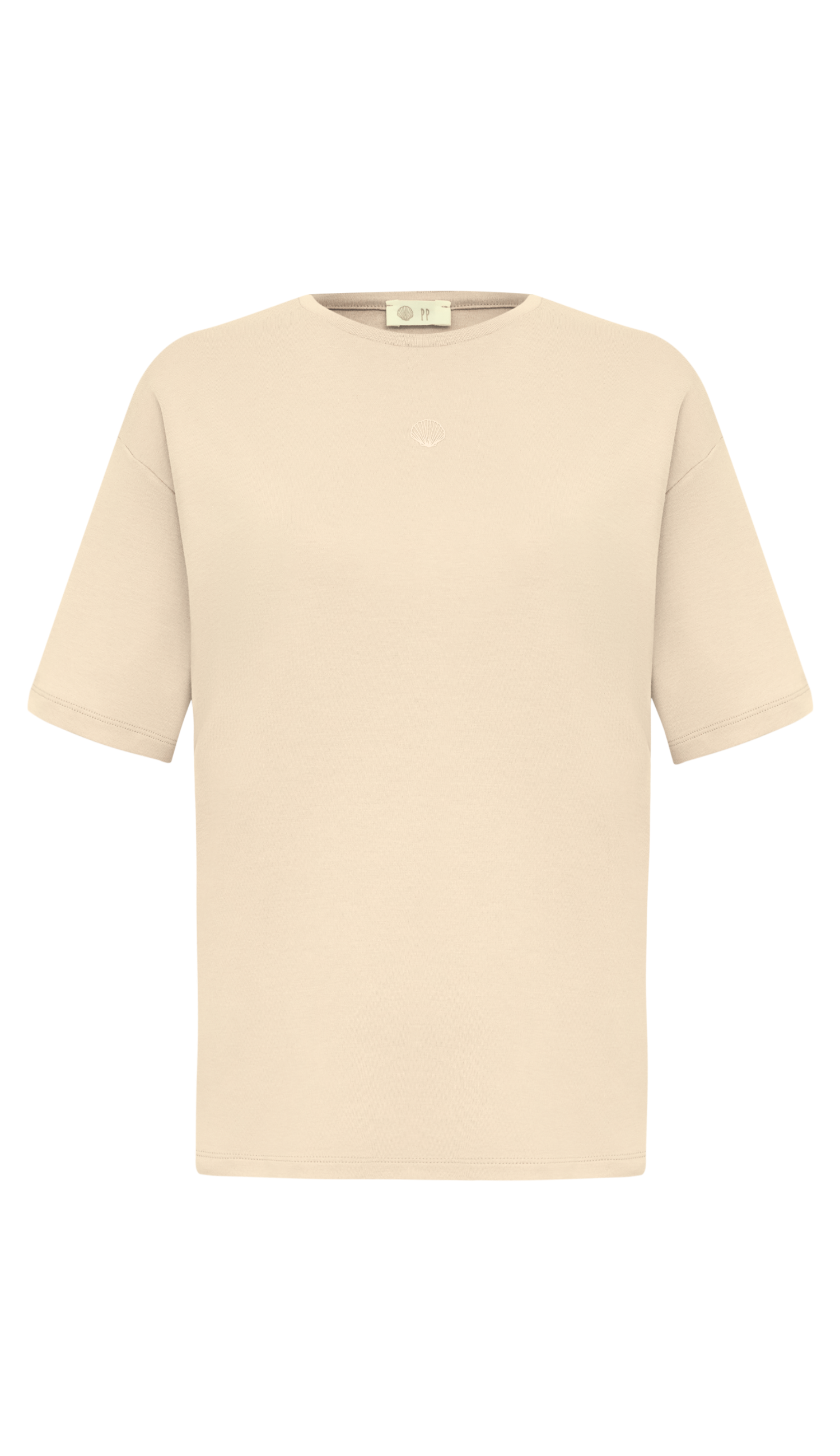 Camiseta reta t-shirt confeccionada em algodão egípcio. Possui modelagem solta e alongada, gola redonda com ribana, ombros deslocados, mangas curtas e o detalhe charmoso no centro do peito com conchinha da Laguna estampada em relevo no mesmo tom da peça.