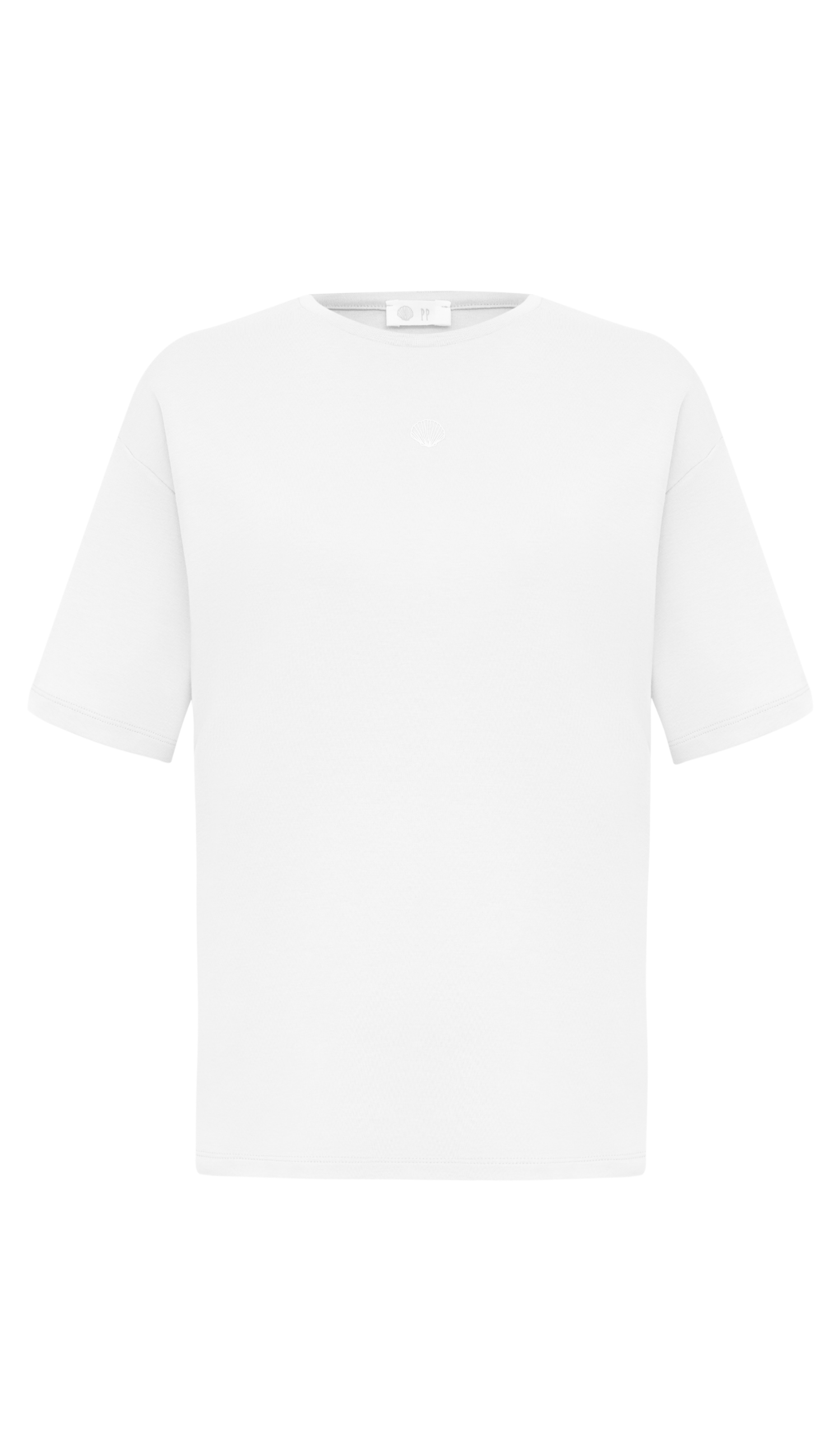 Camiseta reta t-shirt confeccionada em algodão egípcio. Possui modelagem solta e alongada, gola redonda com ribana, ombros deslocados, mangas curtas e o detalhe charmoso no centro do peito com conchinha da Laguna estampada em relevo no mesmo tom da peça.