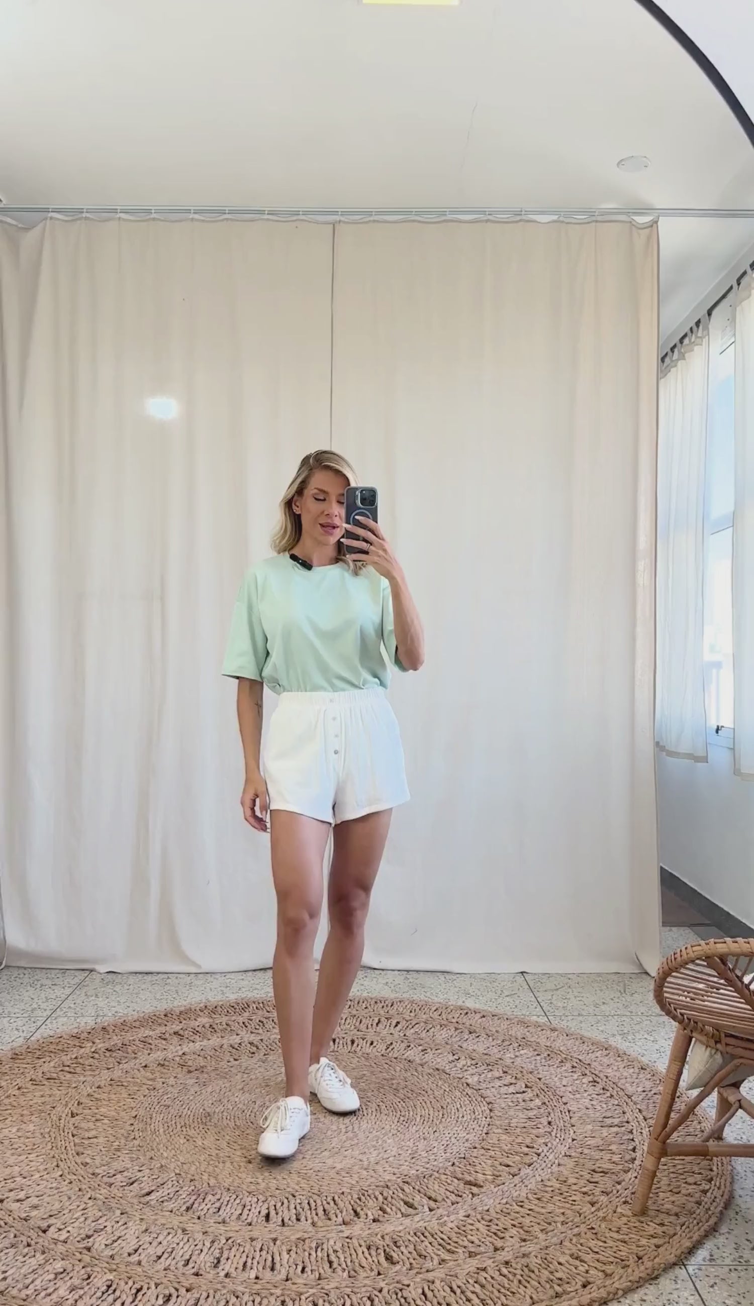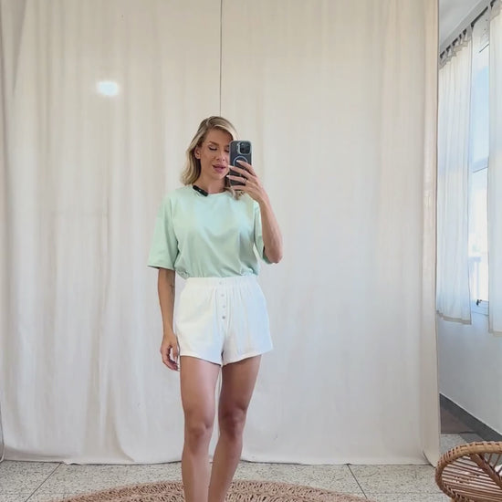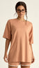 Camiseta t-shirt confeccionada em algodão egípcio. Possui modelagem solta e alongada, gola redonda com ribana, ombros deslocados, mangas curtas e aplicação de etiqueta da Laguna com logo bordado fixada na barra das costas.