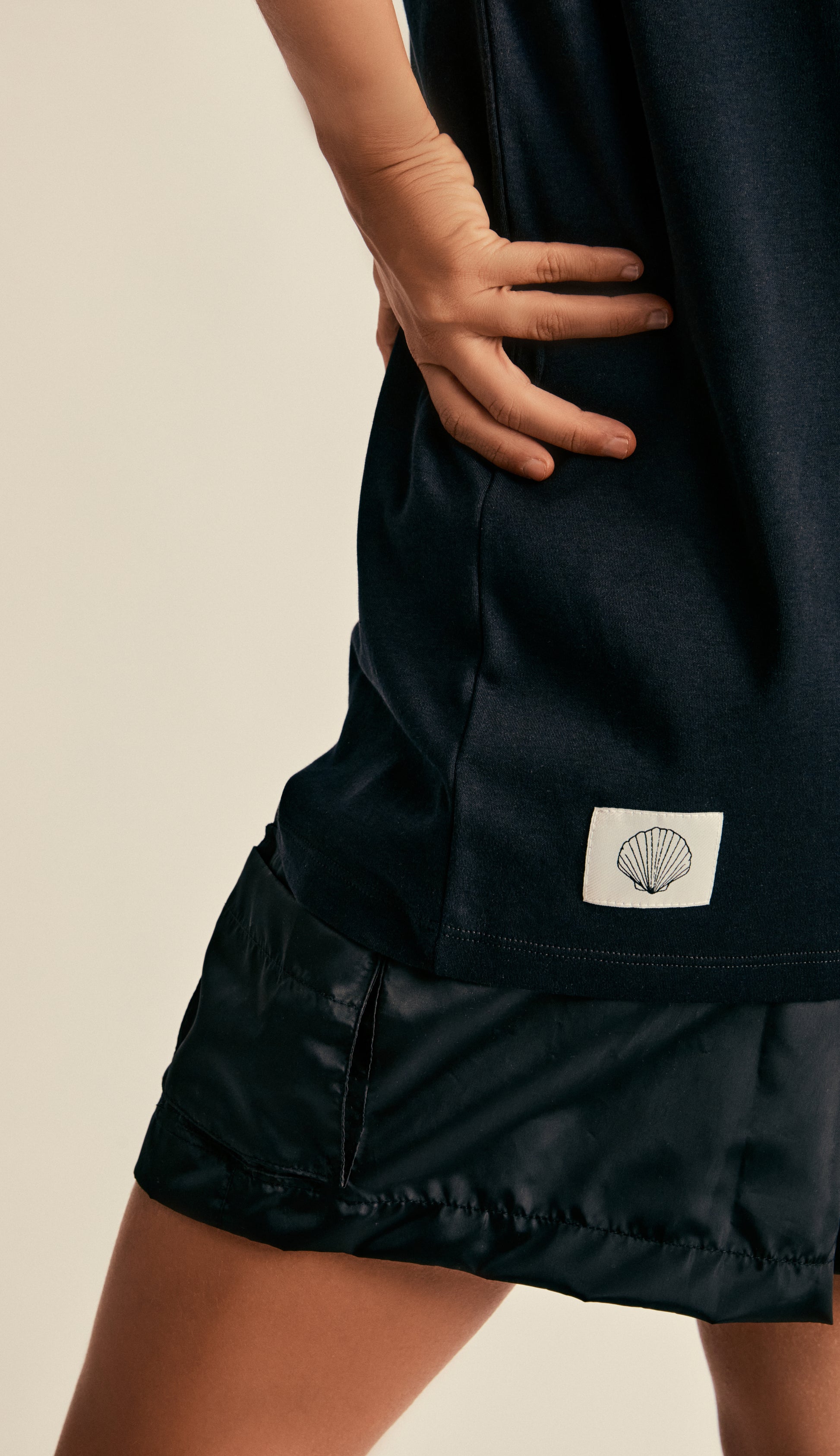 Camiseta t-shirt confeccionada em algodão egípcio. Possui modelagem solta e alongada, gola redonda com ribana, ombros deslocados, mangas curtas e aplicação de etiqueta da Laguna com logo bordado fixada na barra das costas.
