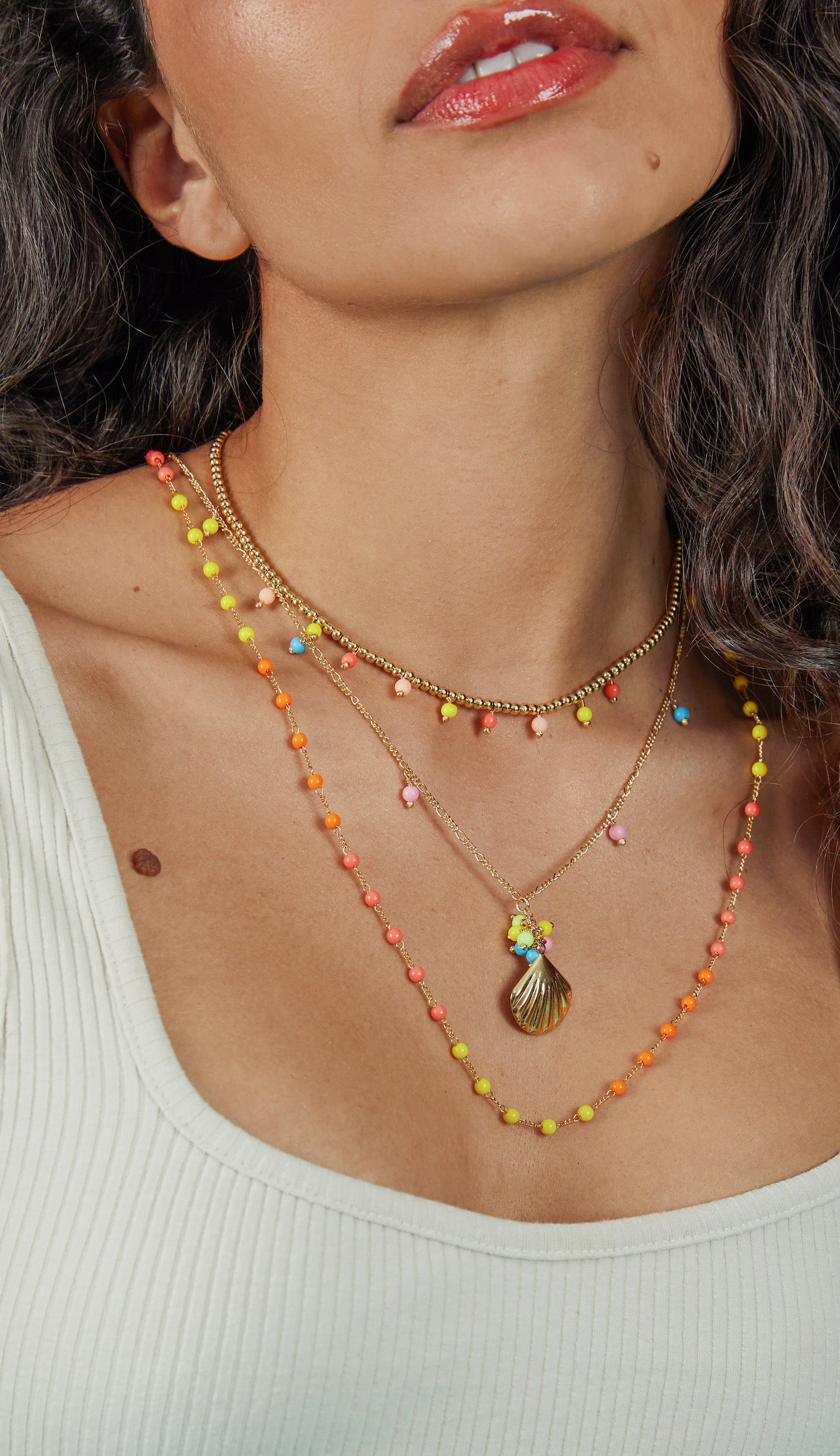 Trio de colares em correntinhas com bolinhas de polymer multicoloridas e pingente de concha em metal.