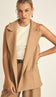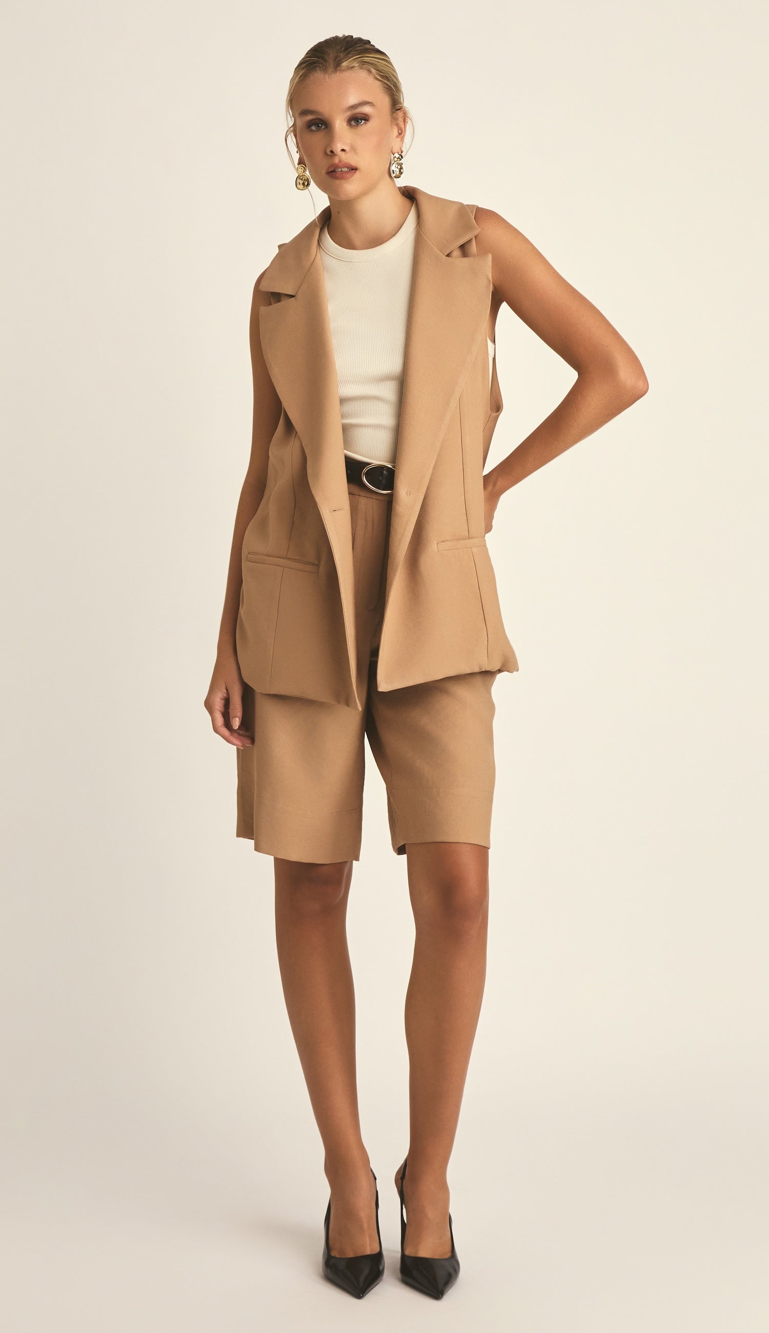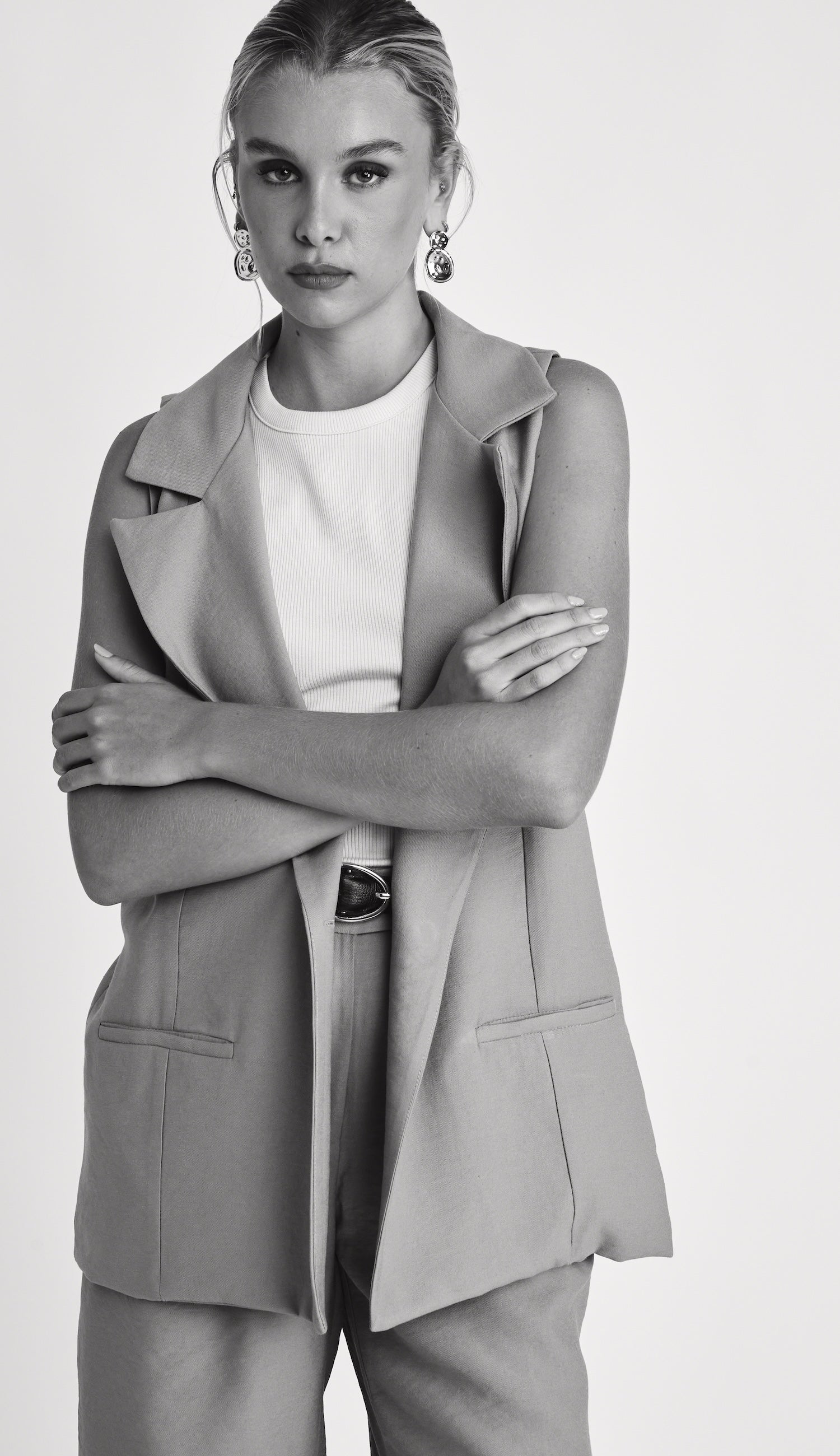 Colete regata com forro, confeccionado em sarja de alfaiataria em poliviscose mais encorpada com aspecto amassadinho. Possui modelagem soltinha e alongada, decote em V com lapela dobrada na gola, bolsos frontais embutidos e fechamento frontal por botão forrado.