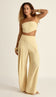 Conjunto com forro, confeccionado em poliéster com aspecto de linho. O top não possui mangas e conta com elástico interno no decote para dar mais firmeza, lastex nas costas, barra arredondada e barbatanas em todo o busto para estruturar a peça no estilo corset. A calça é pantalona e possui cós largo, fechamento lateral por zíper invisível, pregas frontais e bolsos laterais.