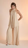 Conjunto confeccionado em crepe leve com forro. A blusa é ampla e alongada, no estilo frente única e possui decote halter com gola alta, sutis preguinhas do decote, sobreposição de tecido assimétrico bem fluido na frente, fechamento traseiro na nuca por botões esmaltados, cava profunda e lindo decote nas costas. A calça é pantalona e possui bolsos laterais e fechamento lateral por zíper invisível.