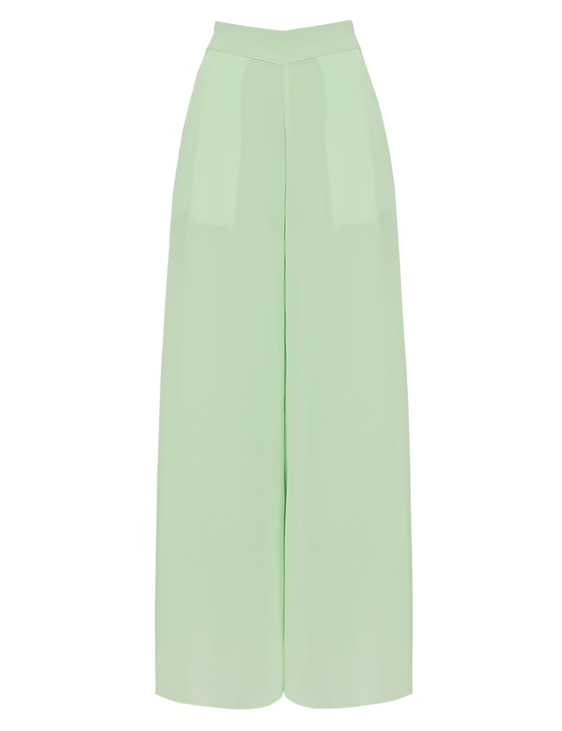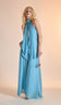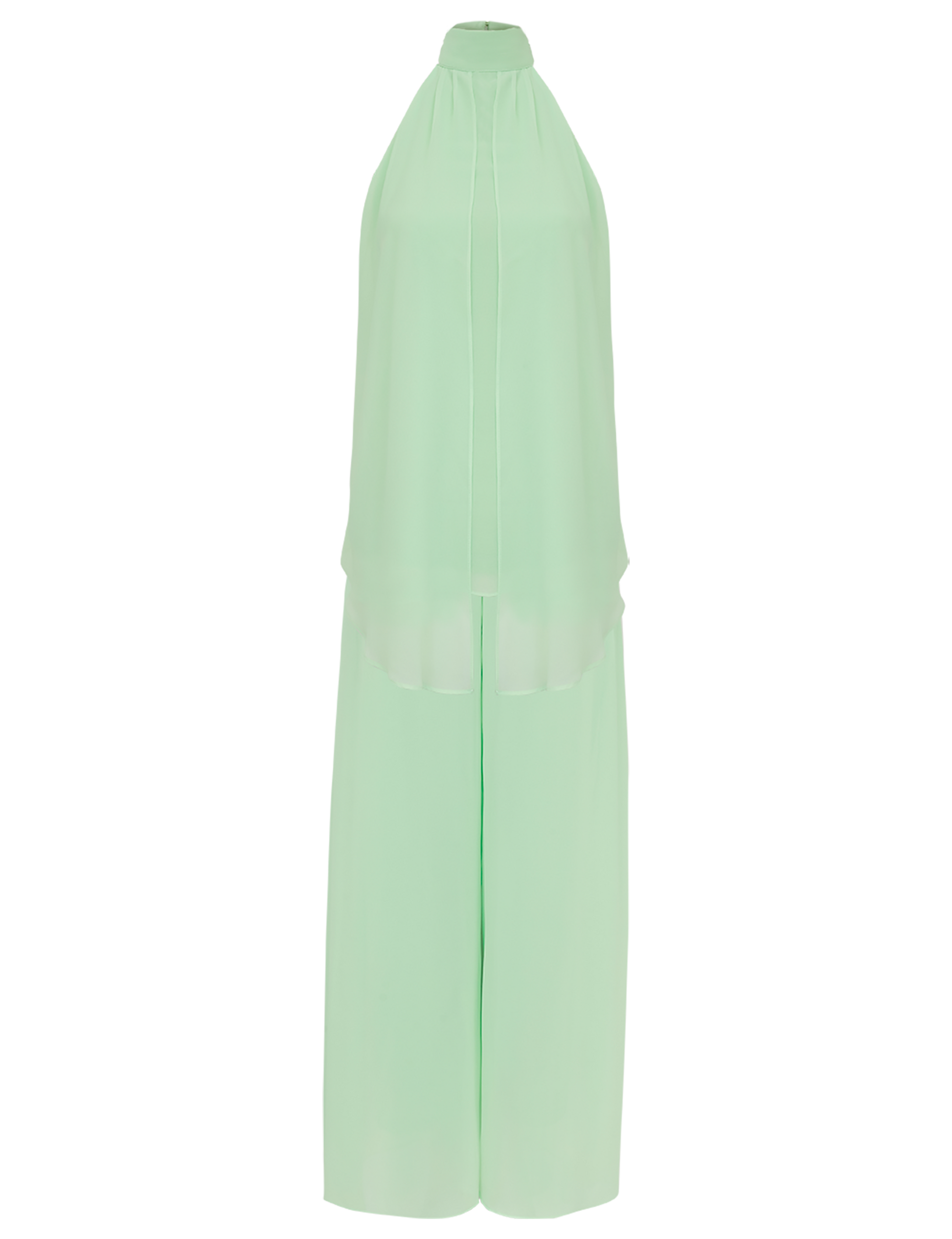 Conjunto confeccionado em crepe leve com forro. A blusa é ampla e alongada, no estilo frente única e possui decote halter com gola alta, sutis preguinhas do decote, sobreposição de tecido assimétrico bem fluido na frente, fechamento traseiro na nuca por botões esmaltados, cava profunda e lindo decote nas costas. A calça é pantalona e possui bolsos laterais e fechamento lateral por zíper invisível.