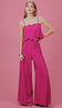 Conjunto confeccionado em viscolinho com forro. O top possui decote reto com recortes geométricos arredondados, alcinhas reguláveis, elástico franzido nas costas e modelagem soltinha. A calça é pantalona e possui recortes geométricos arredondados no cós, recortes com nesgas e detalhes em vivo no comprimento e fechamento lateral ´por zíper invisível.