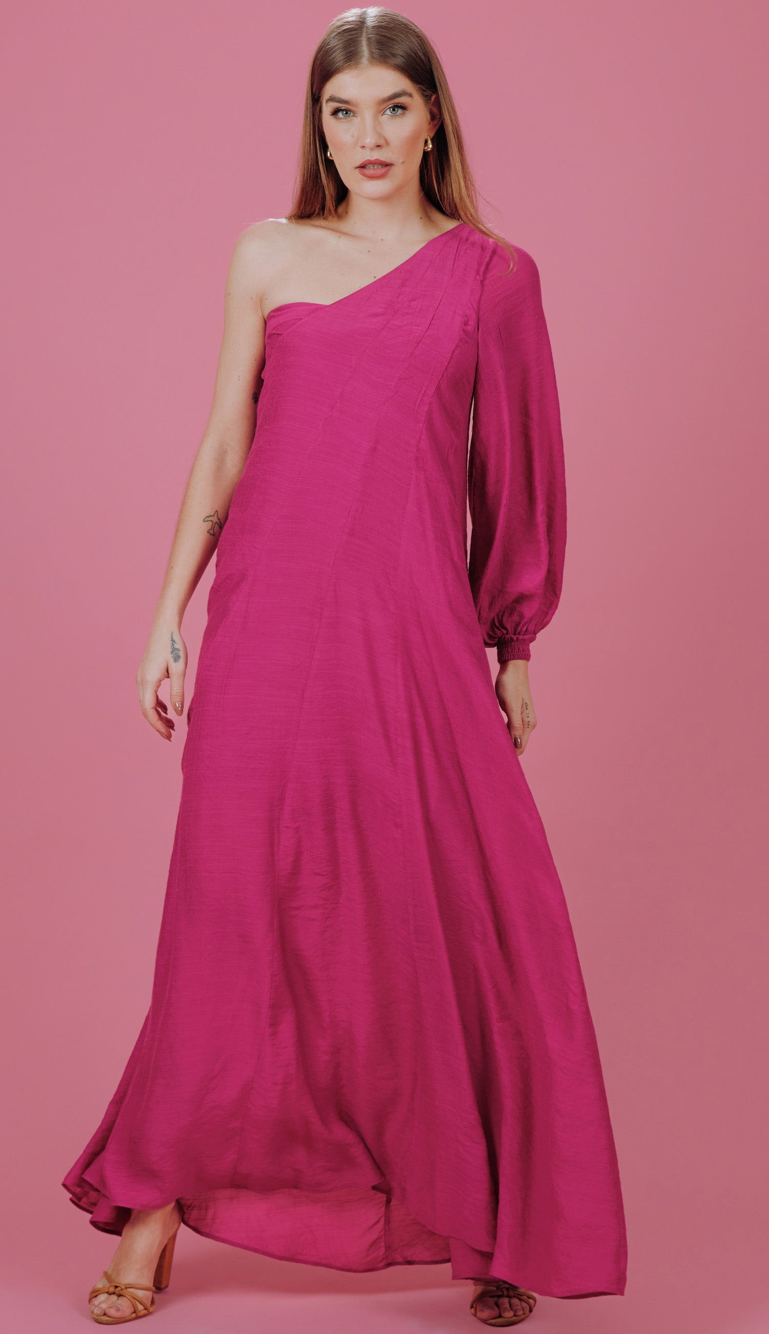 Conjunto com forro, confeccionado em poliviscose texturizada com aspecto de linho. O vestido é longo e amplo e possui decote ombro único bem cavado, manga longa bufante com punho em lastex e nesgas que dão um belo movimento à peça. O top não possui mangas e conta com decote coração com silicone elástico interno para maior segurança, pala e recortes que modelam o busto, barbatanas logo abaixo do busto para sustentação e lastex franzido nas costas.