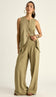 Conjunto confeccionado em linho. A blusa é regata. Possui modelagem solta e alongada, decote redondo, fechamento frontal por botões forrados, bolsos frontais, recortes arredondados na barra frente, pala com preguinha nas costas e parte traseira levemente maior do que a parte da frente, no estilo mullet. A calça é pantalona e tem forro. Possui cós largo que acintura a peça, pregas frontais, bolsos laterais e fechamento lateral por zíper invisível.