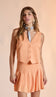 Conjunto confeccionado em viscose twill com forro. O colete é regata e possui decote em V, fechamento frontal por botões forrados e recortes que modelam a peça. O shorts saia é curto, estilo godê com sobreposição da saia toda pregueada, com pala larga na cintura e fechamento traseiro por zíper invisível.