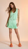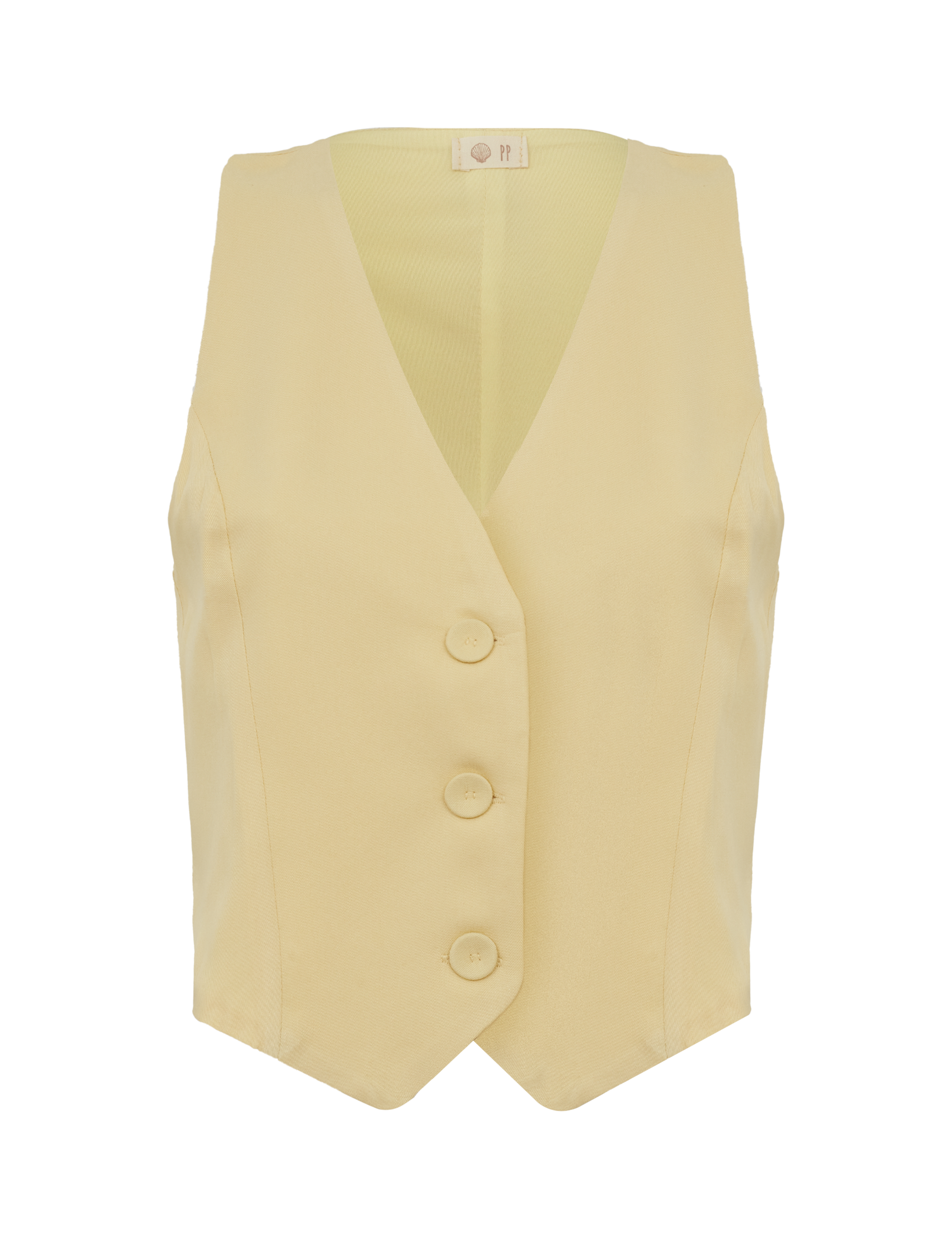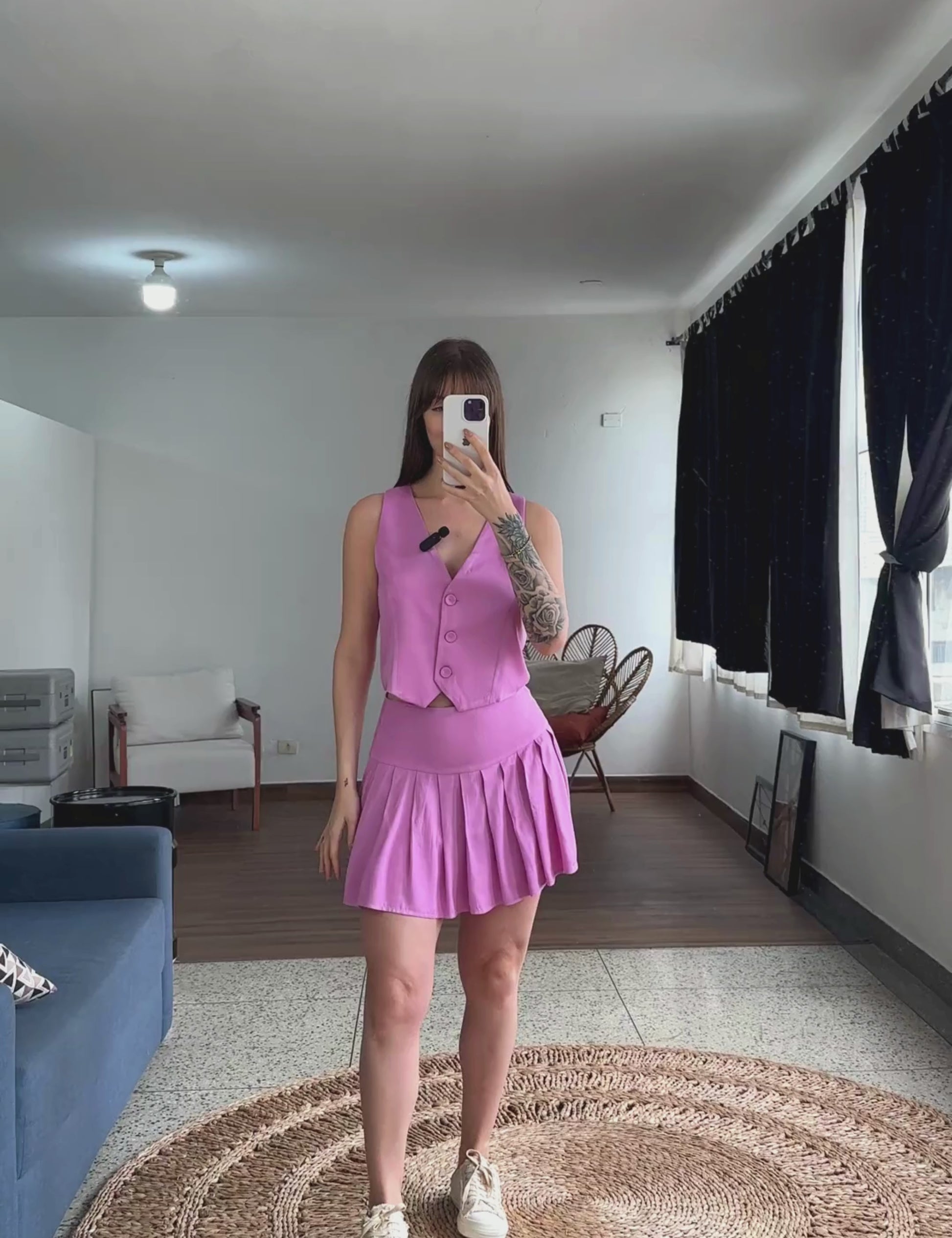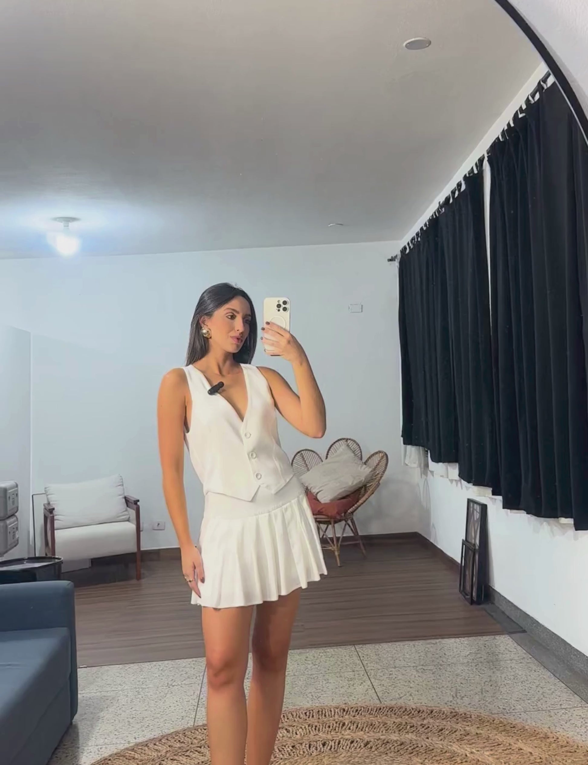 Conjunto confeccionado em viscose twill com forro. O colete é regata e possui decote em V, fechamento frontal por botões forrados e recortes que modelam a peça. O shorts saia é curto, estilo godê com sobreposição da saia toda pregueada, com pala larga na cintura e fechamento traseiro por zíper invisível.