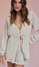 Conjunto confeccionado em crepe leve com forro. A blusa é soltinha e alongada, possui mangas longas com elástico franzido e botão esmaltado nos punhos, decote em V com fechamento frontal por botõezinhos esmaltados no busto e tirinha embutida para amarração logo abaixo, criando uma abertura bem charmosa no corpo da peça, que deixa a parte de baixo à mostra. O shorts possui modelagem evasê, justinha na cintura e soltinha nas pernas e conta com pala no cós e fechamento lateral por zíper invisível.