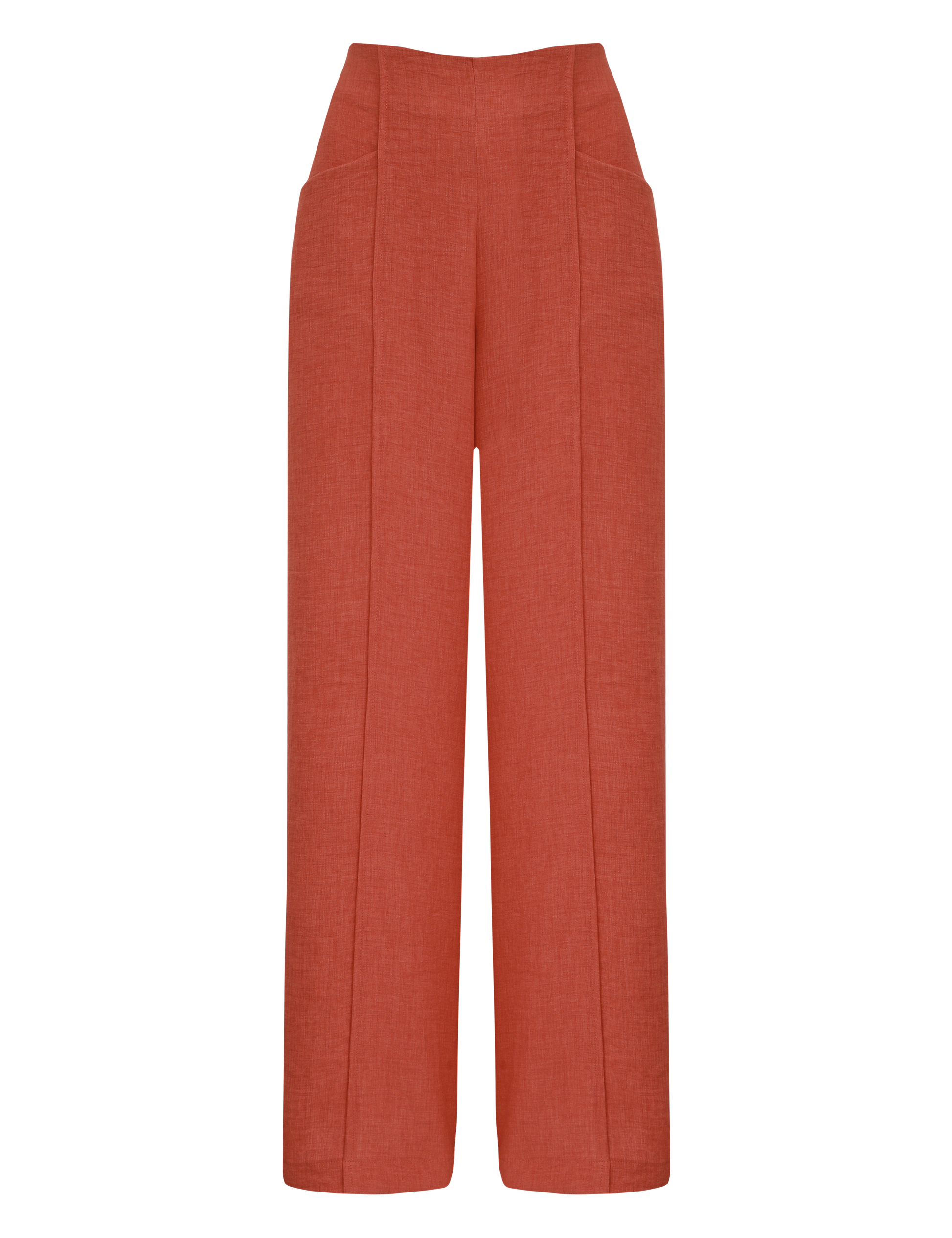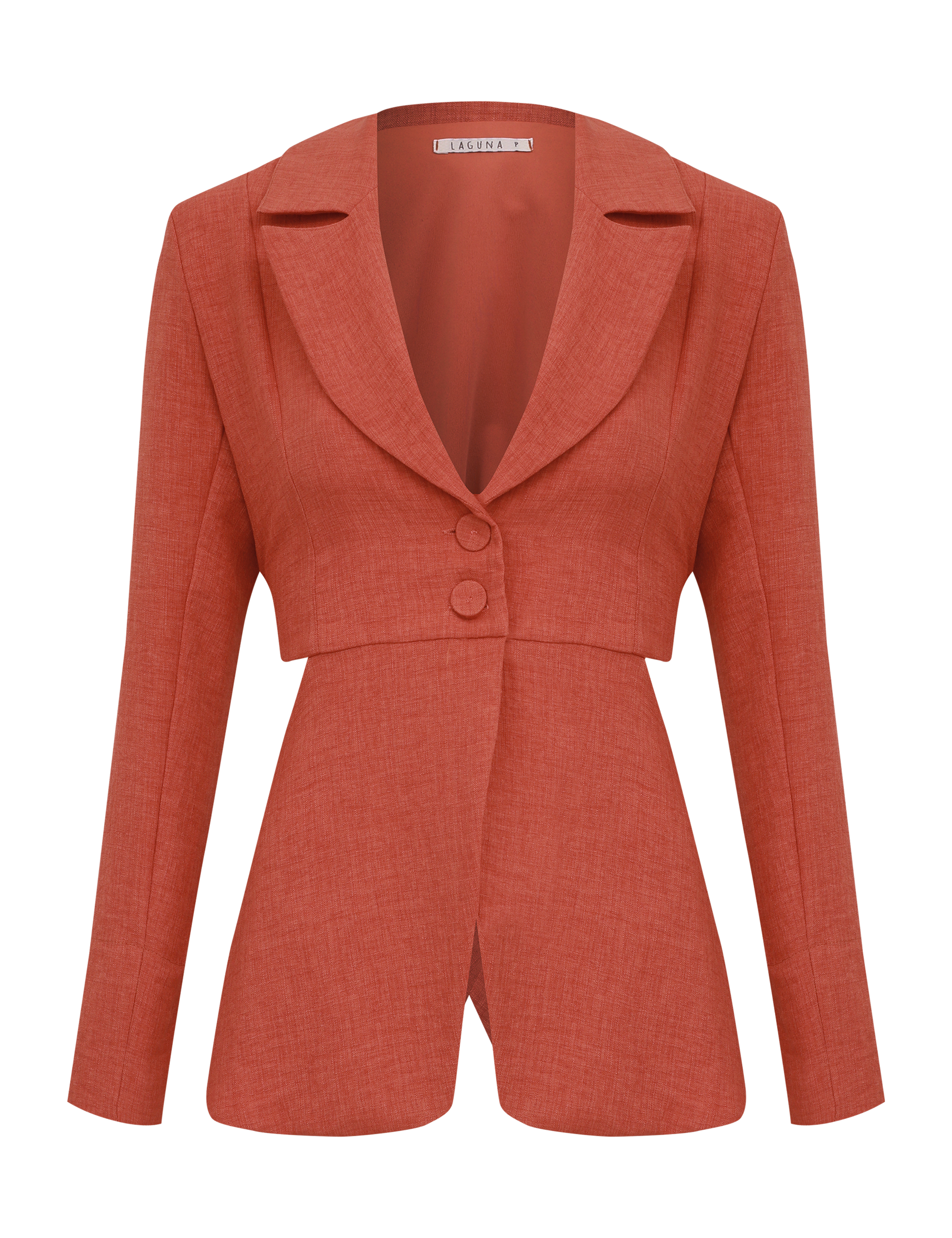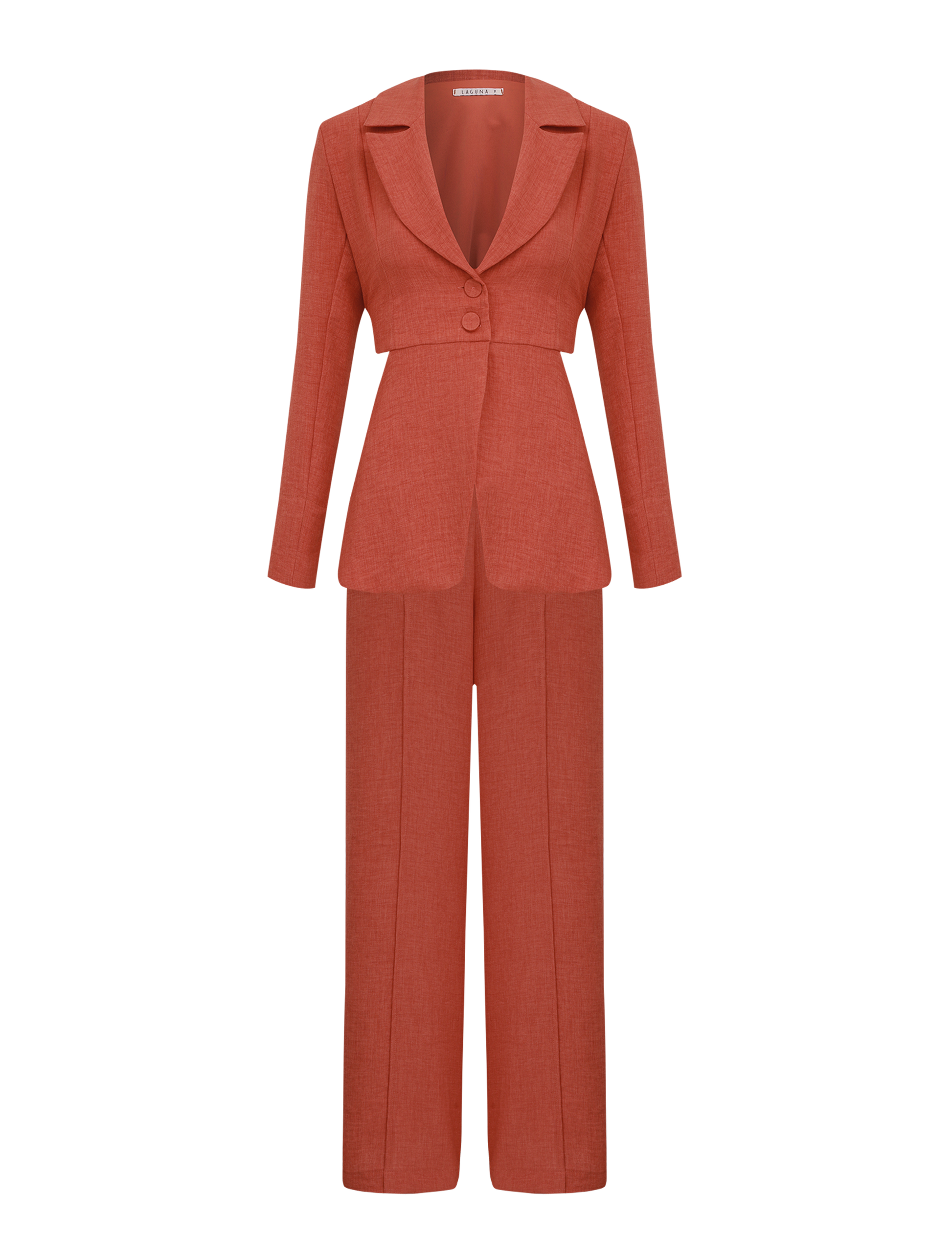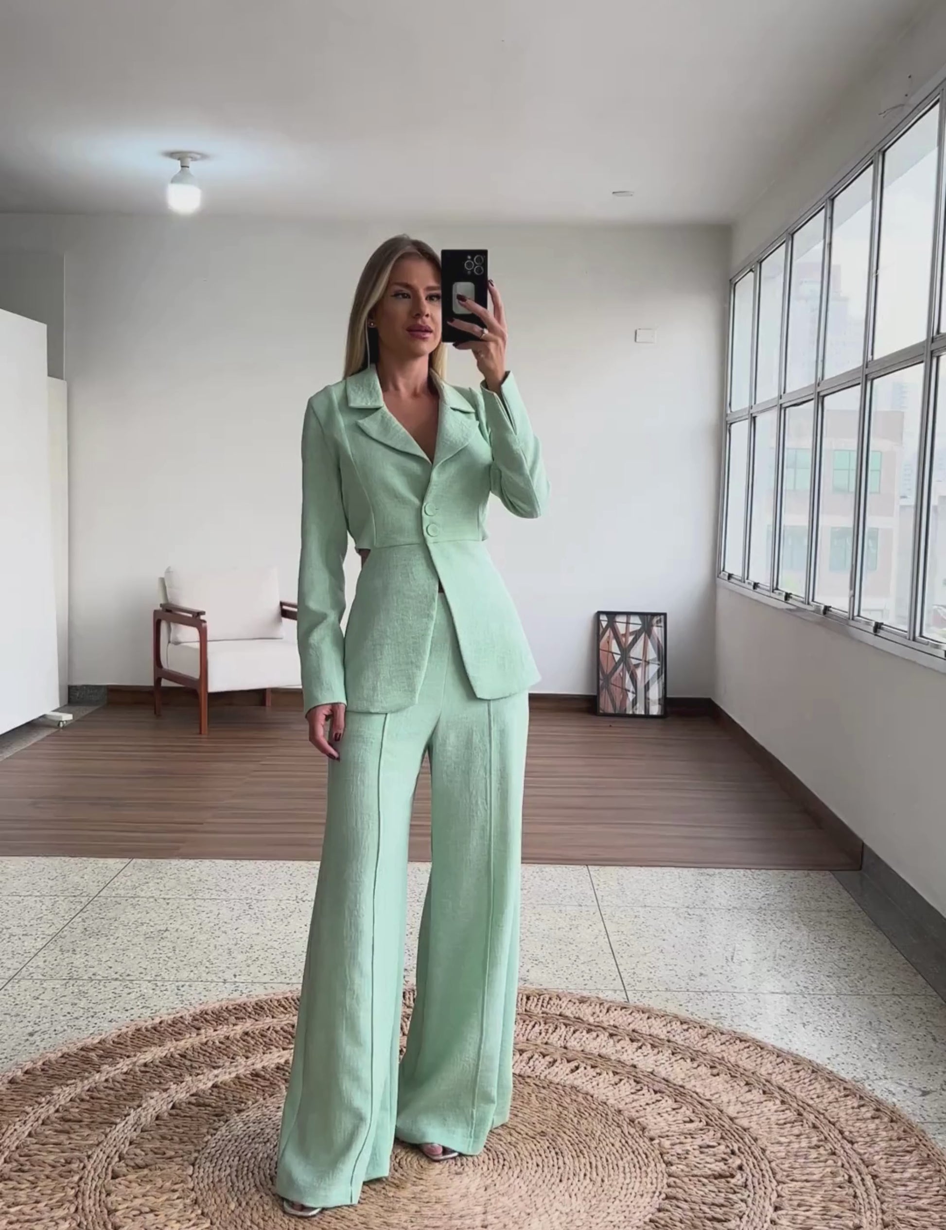 Conjunto com forro, confeccionado em poliéster com aspecto de linho com efeito marmorizado. O blazer mais descontruído possui comprimento alongado, mangas longas com abertura lateral, lapelas dobradas na gola, fechamento frontal por botão único forrado, recorte vazado nas costas com elástico e fendinha na barra traseira. A calça é pantalona, possui bolsos e vincos frontais e fechamento lateral por zíper invisível. Esse conjunto une a elegância do linho com a praticidade do poliéster, que não amassa facilmente.