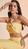Conjunto confeccionado em crepe de alfaiataria. O top possui forro e não tem mangas; conta com lastex franzido nas costas para maior conforto, decote reto com silicone elástico interno para dar sustentação e tecido sobreposto com tira no centro e franzidos, parecendo um laço. A saia é longa e possui tecido duplo pra não ficar transparente, modelagem ajustada e elástico interno na cintura.