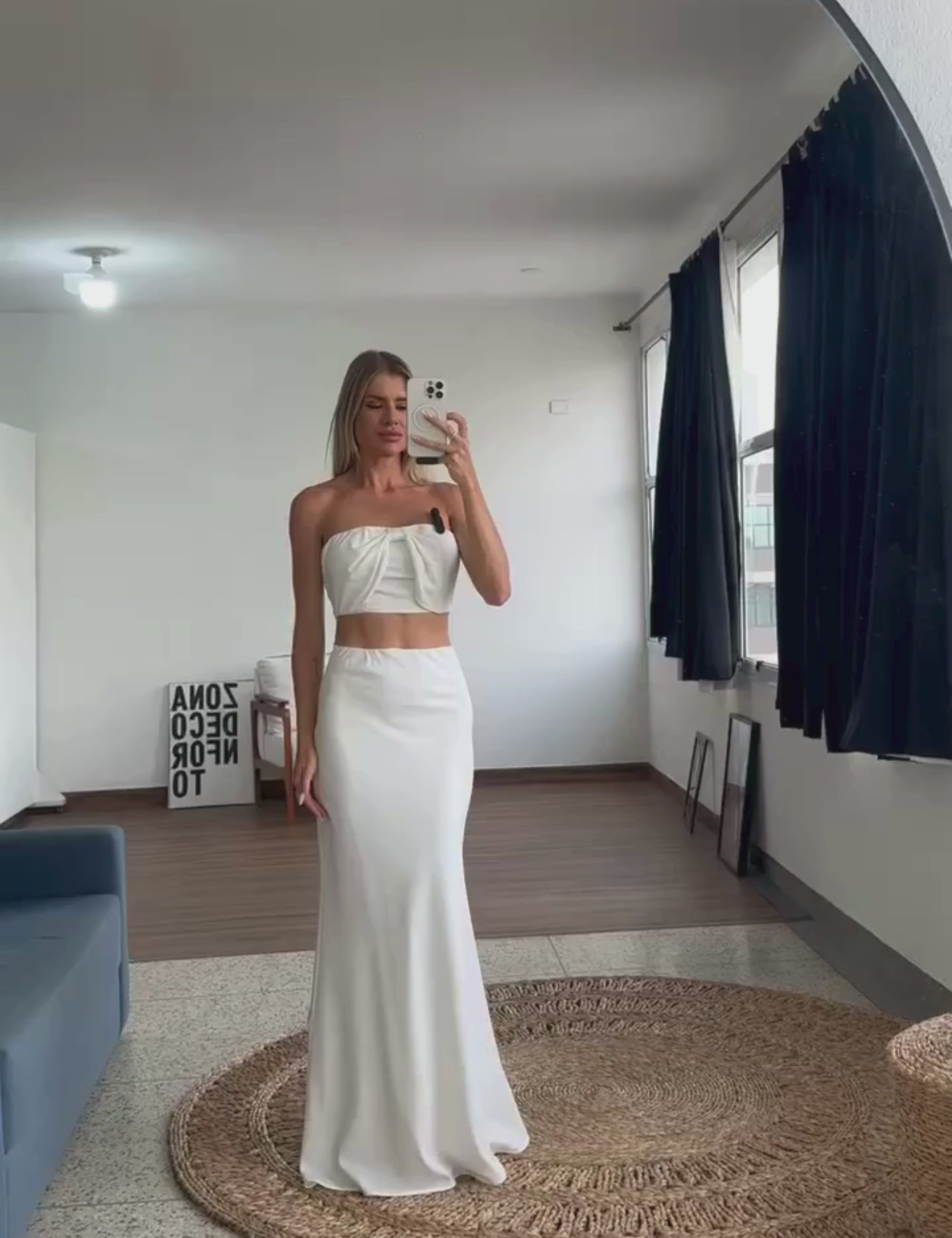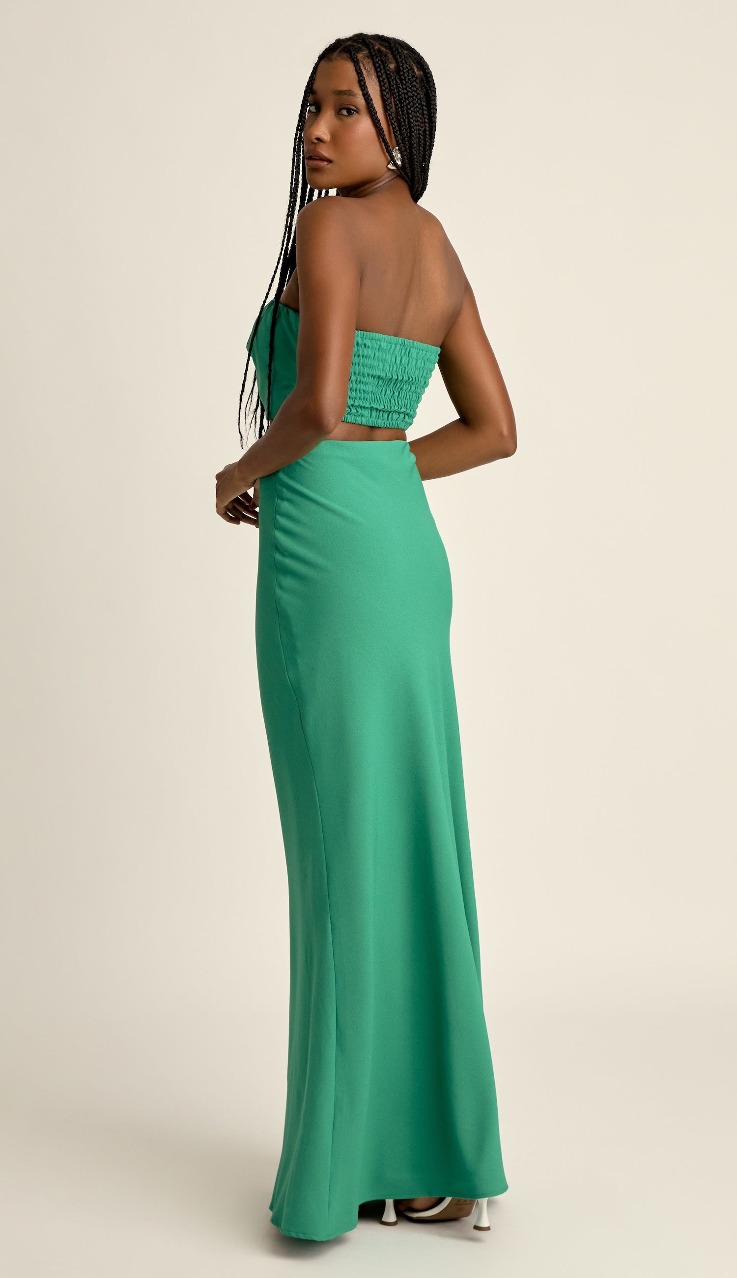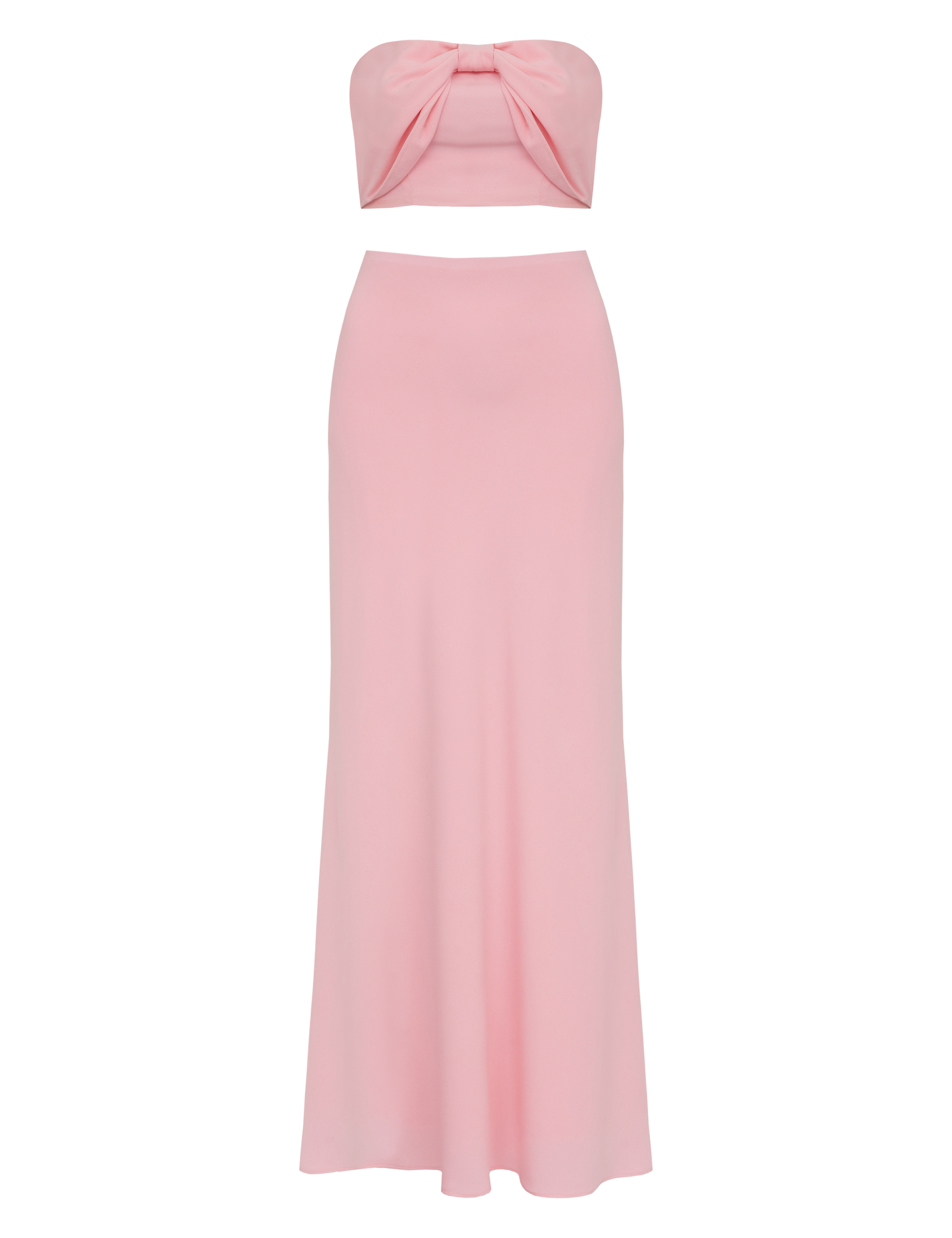 Conjunto confeccionado em crepe de alfaiataria. O top possui forro e não tem mangas; conta com lastex franzido nas costas para maior conforto, decote reto com silicone elástico interno para dar sustentação e tecido sobreposto com tira no centro e franzidos, parecendo um laço. A saia é longa e possui tecido duplo pra não ficar transparente, modelagem ajustada e elástico interno na cintura.
