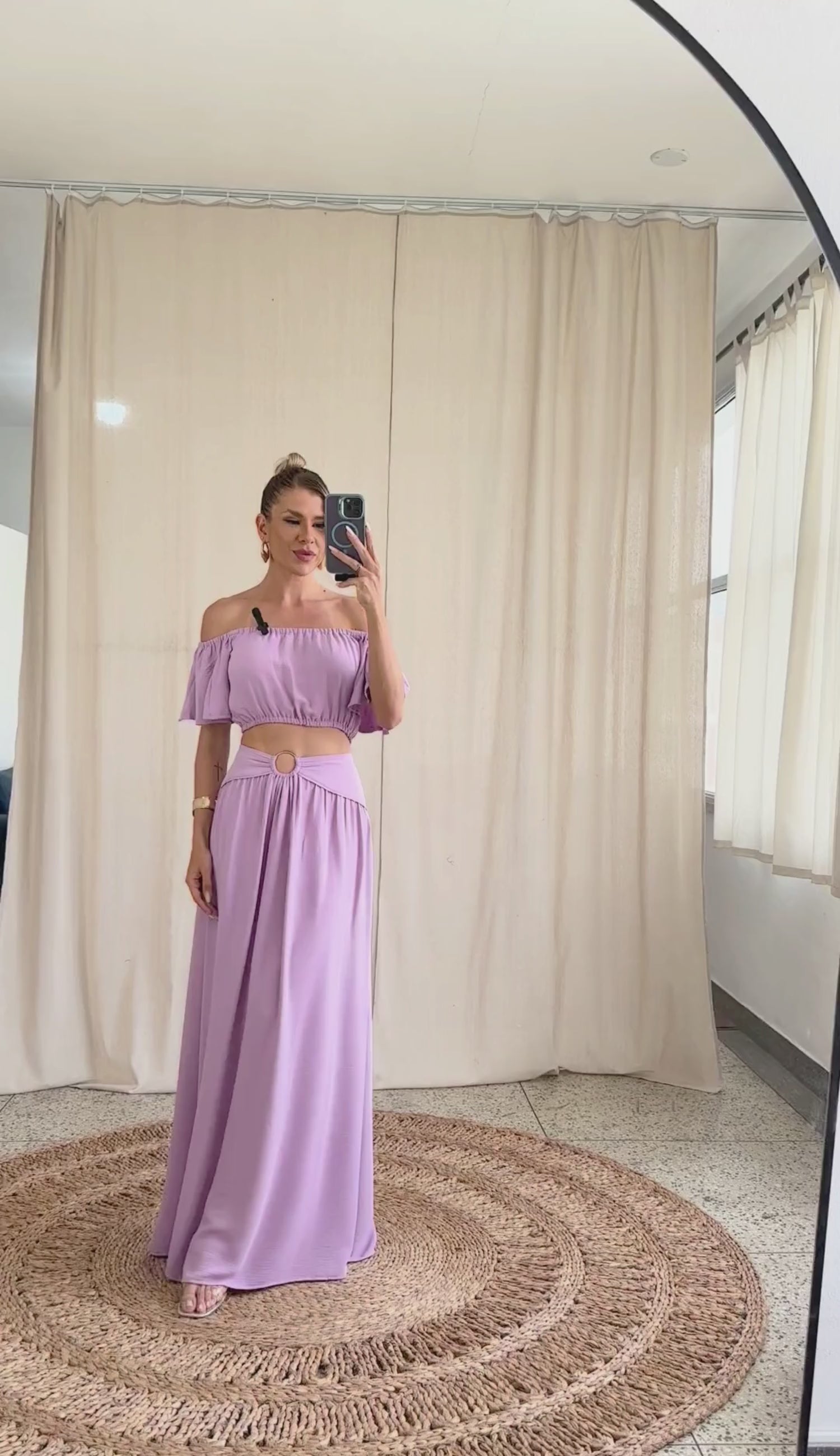 Conjunto com forro, confeccionado em crepe texturizado com efeito amassadinho. A blusa é cropped e possui decote ciganinha com elástico franzido, mangas sino curtas e elástico também na barra, dando um efeito blusê. A saia é longa em A e possui elástico mais grosso nas costas do cós e pala com detalhe em vivo, argola de metal e franzidinhos no centro da parte frontal do cós.