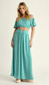 Conjunto com forro, confeccionado em crepe texturizado com efeito amassadinho. A blusa é cropped e possui decote ciganinha com elástico franzido, mangas sino curtas e elástico também na barra, dando um efeito blusê. A saia é longa em A e possui elástico mais grosso nas costas do cós e pala com detalhe em vivo, argola de metal e franzidinhos no centro da parte frontal do cós.