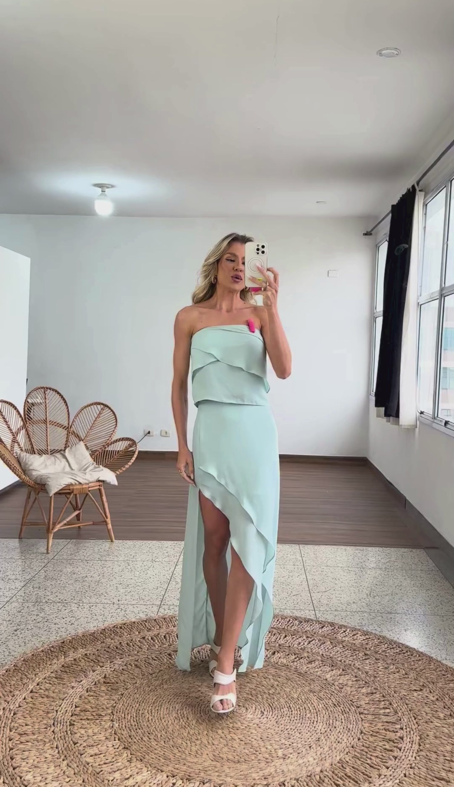 Conjunto confeccionado em crepe leve com forro. A blusa é cropped, não tem mangas e possui decote reto com elástico interno para maior segurança, modelagem soltinha e camadas de babados diagonais sobrepostas no comprimento. A saia é longa, soltinha e possui fechamento traseiro por zíper invisível, duas camadas sobrepostas na frente com recorte diagonal criando uma linda fenda lateral assimétrica, que dá um ar bem moderno e charmoso ao look.