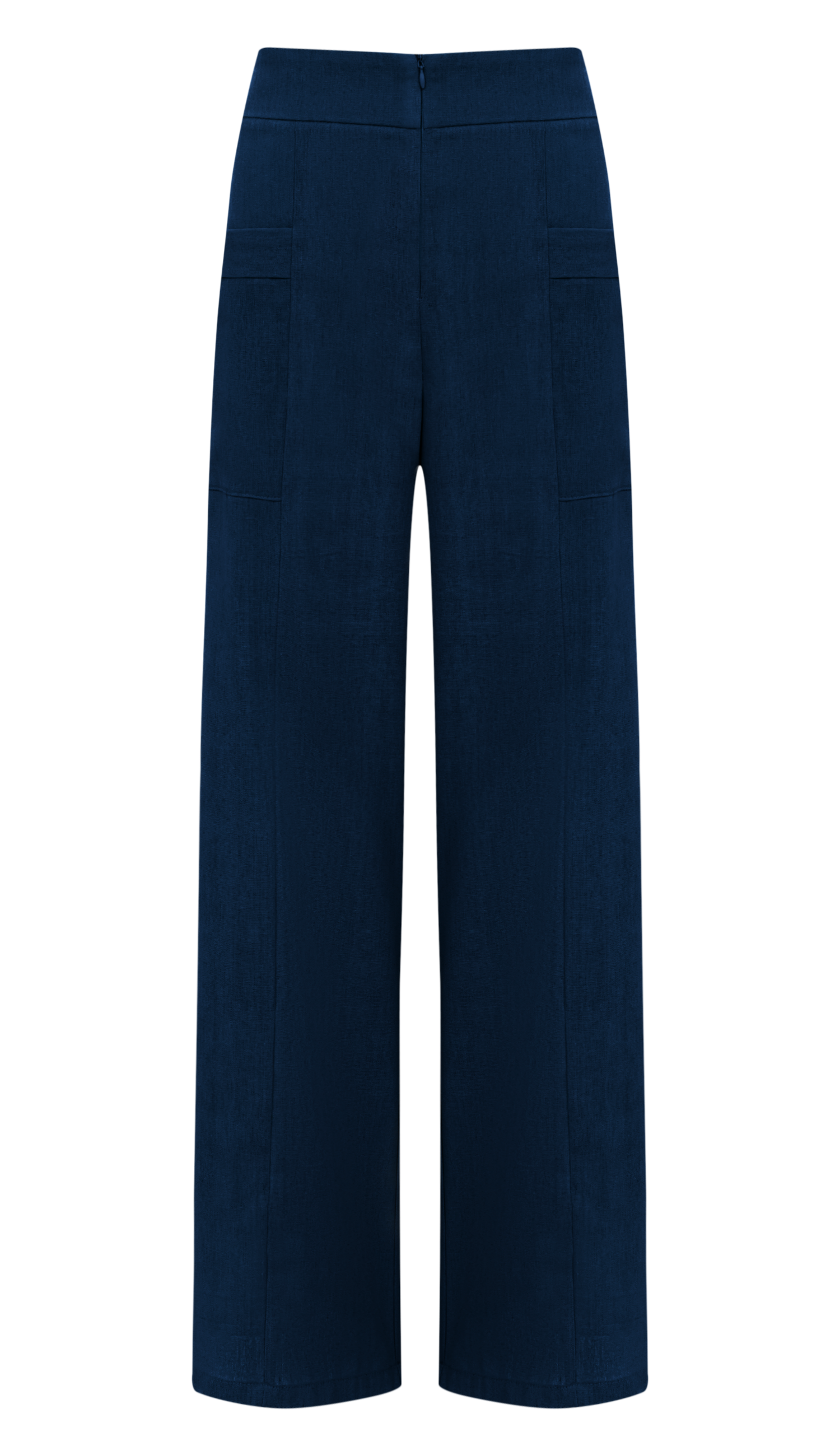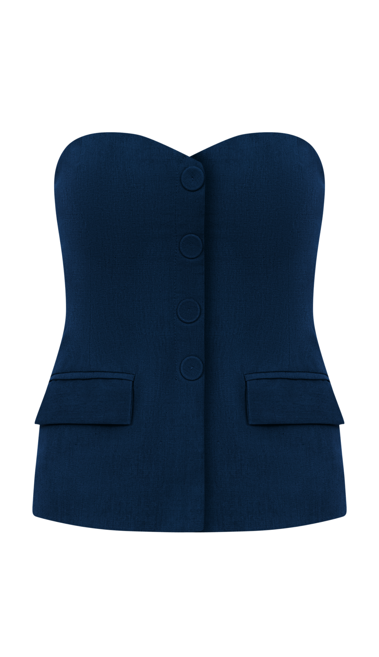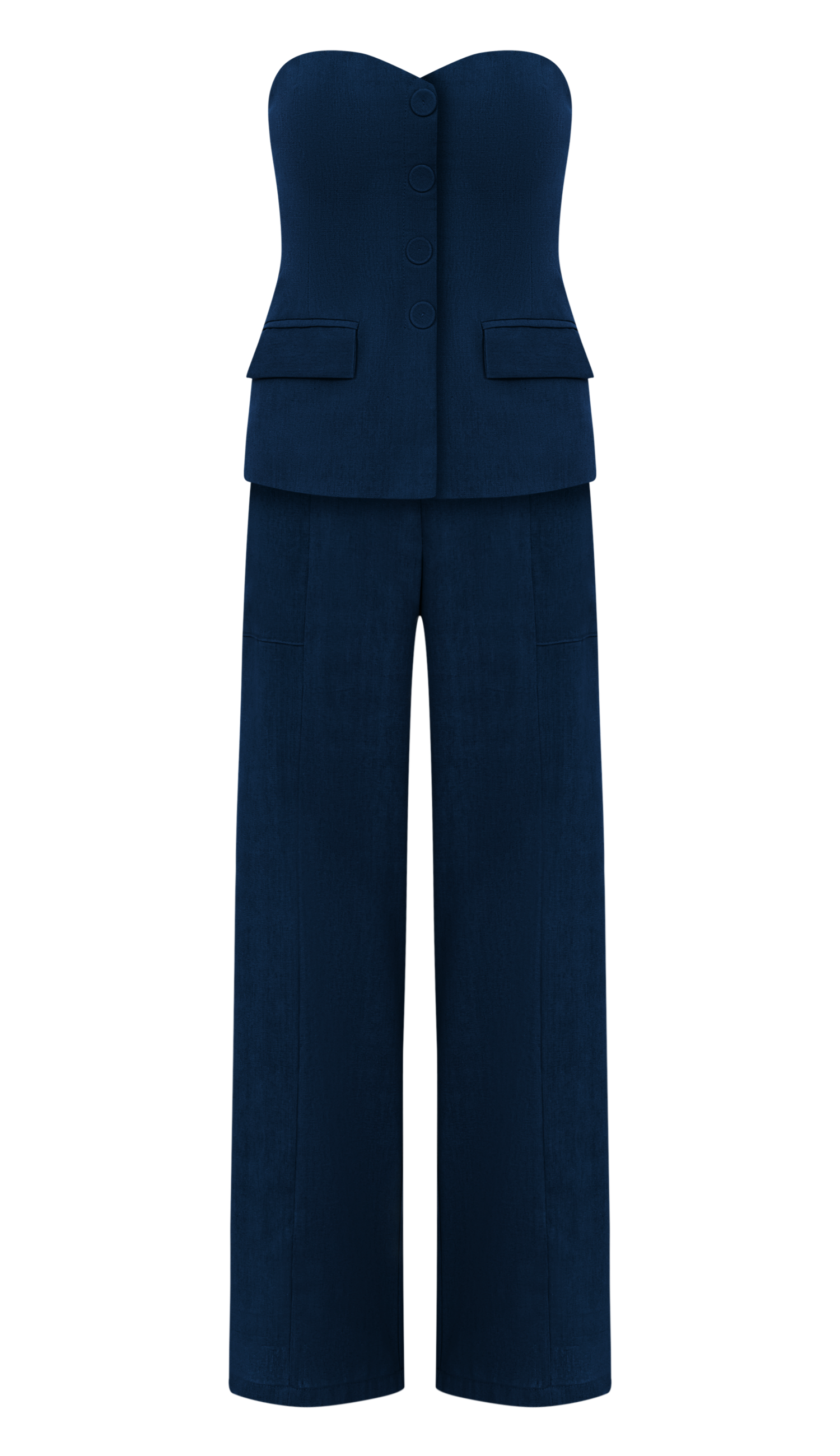Conjunto confeccionado em linho com forro nas peças inteiras. A blusa é mais alongada e sem mangas; possui decote coração com silicone interno para maior segurança, recortes que modelam a peça, elástico interno nas costas, fechamento lateral por zíper invisível, detalhe frontal de botões forrados de enfeite e bolsos com lapelas. A calça é pantalona e possui fechamento frontal por zíper invisível, recortes frontais na vertical que dão uma elegância a mais na peça e bolsos laterais com lapela dobrada.