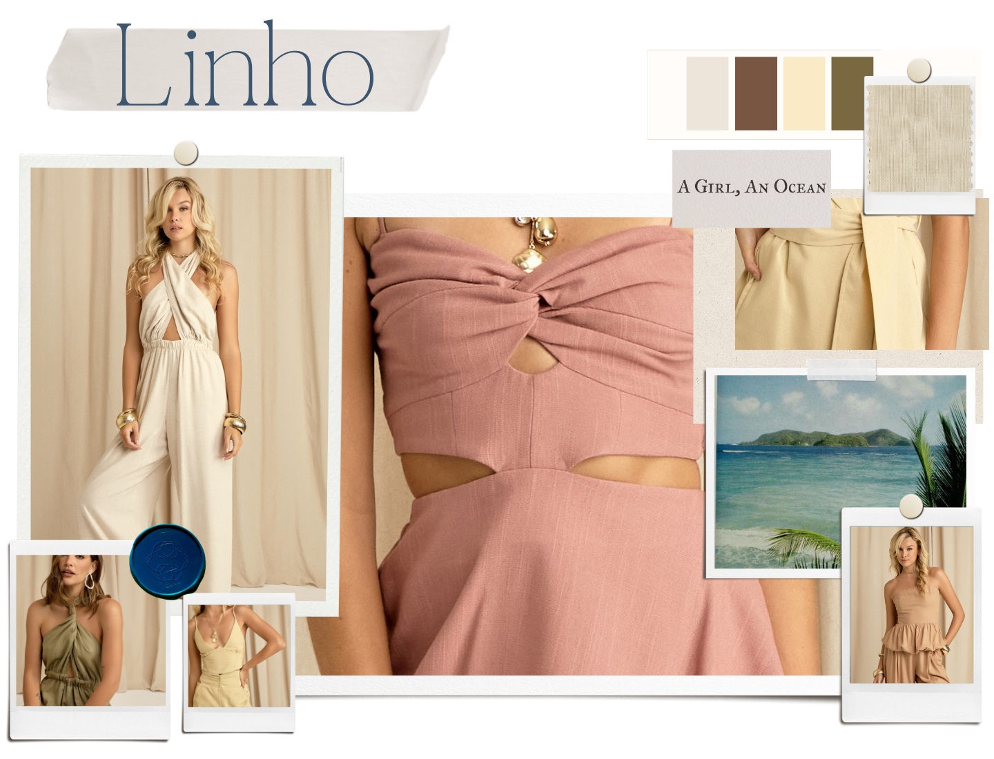 Conjunto confeccionado em linho. A blusa é mais alongada, não possui mangas e conta com forro, decote coração com silicone interno para maior segurança, recortes que modelam a peça, elástico interno nas costas, fechamento lateral por zíper invisível, detalhe frontal de botões forrados de enfeite e bolsos com lapelas. A calça é pantalona e possui fechamento frontal por zíper invisível, riscas frontais que dão uma elegância a mais na peça e bolsos laterais com lapela dobrada.