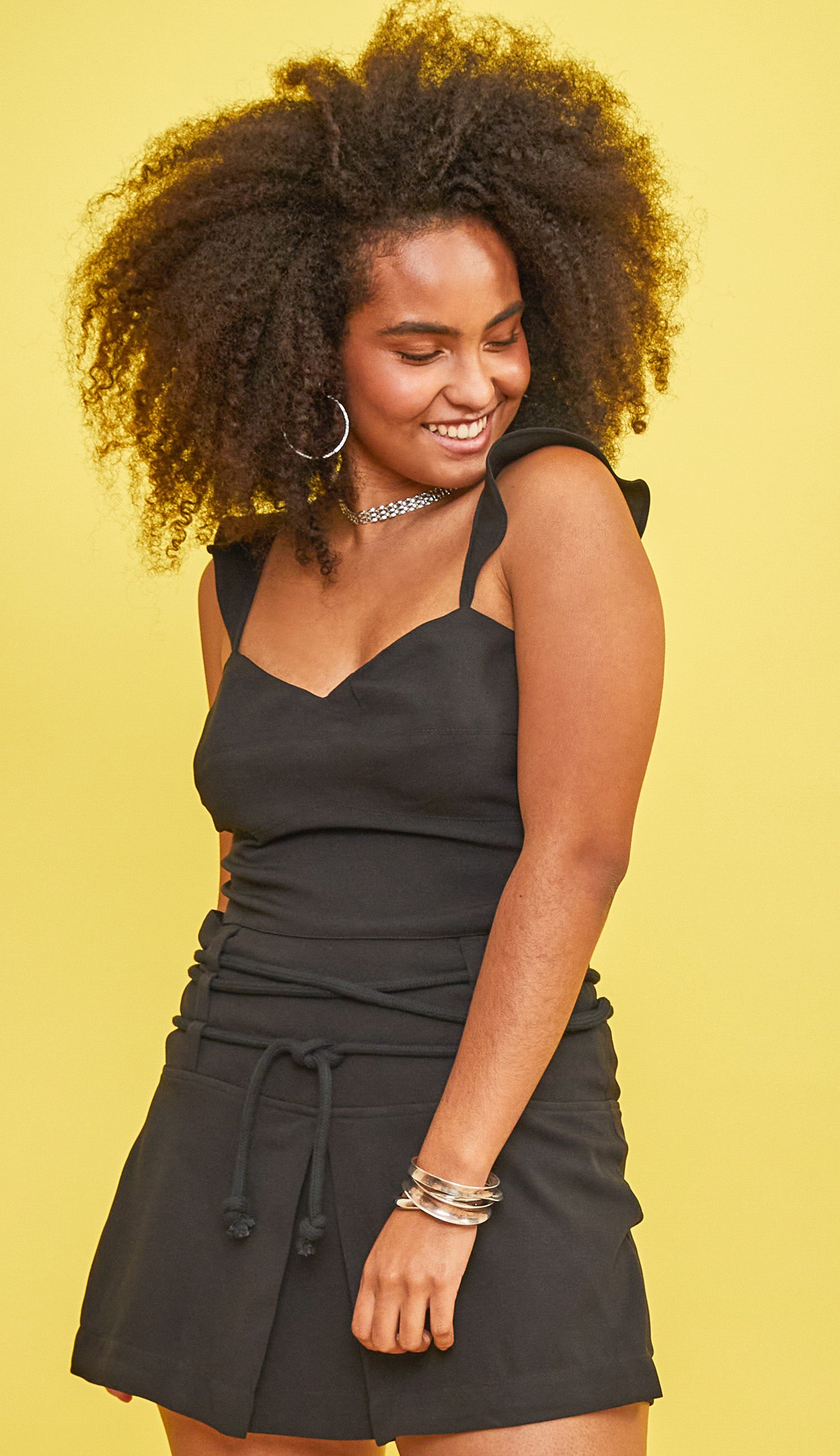 Conjunto confeccionado em crepe de alfaiataria. O cropped possui recortes no busto, alça com babadinho e fechamento por zíper de metal nas costas. O shorts - saia possui prega na frente, cinto de corda tingido na cor e fechamento por ziper de metal nas costas. Fresco e confortável, o conjunto Celine é um dos nossos best sellers, que modela o corpo e tem um charme todo especial.