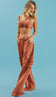 Conjunto confeccionado em poliéster com aspecto de liocel e efeito amassadinho. O top possui forro e conta com alcinhas reguláveis, lastex franzido nas costas, decote coração levemente franzido com elástico interno para dar sustentação e detalhe fixo no centro do busto para amarrar no pescoço, parecendo um colar. A calça é no estilo wide leg e conta com fechamento frontal por zíper, bolsos frontais com pala, bolsos laterais com lapela nas pernas no estilo cargo e bolsos traseiros também com lapelas e tirinhas embutidas com reguladores no cós para ajuste da cintura. O tecido garante praticidade e elegância, pois, devido à sua composição, não amassa facilmente e o aspecto de 'tecido nobre' dá um ar sofisticado ao look.