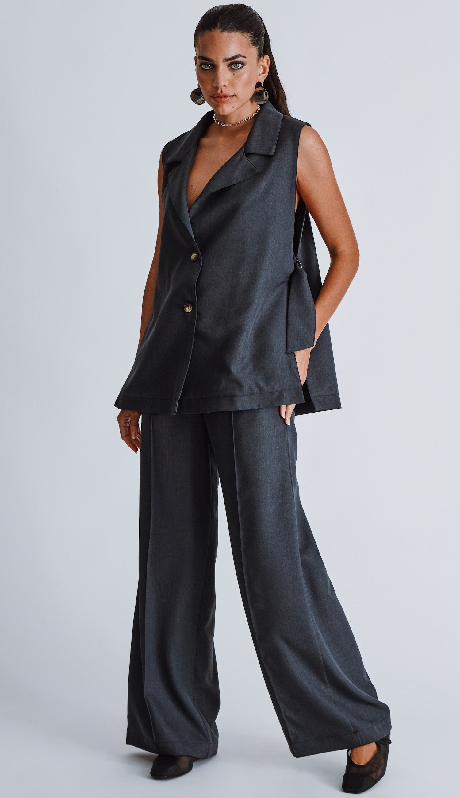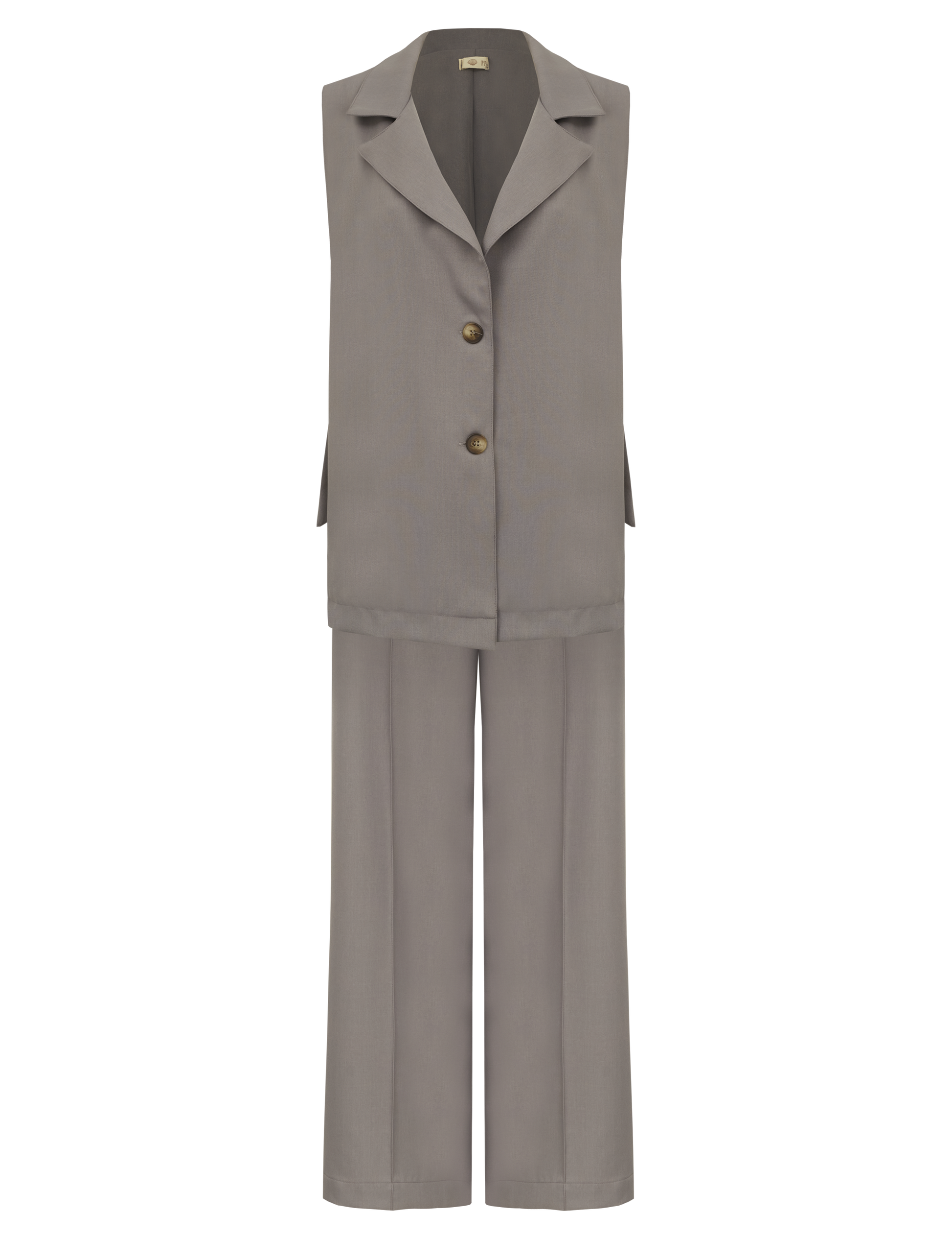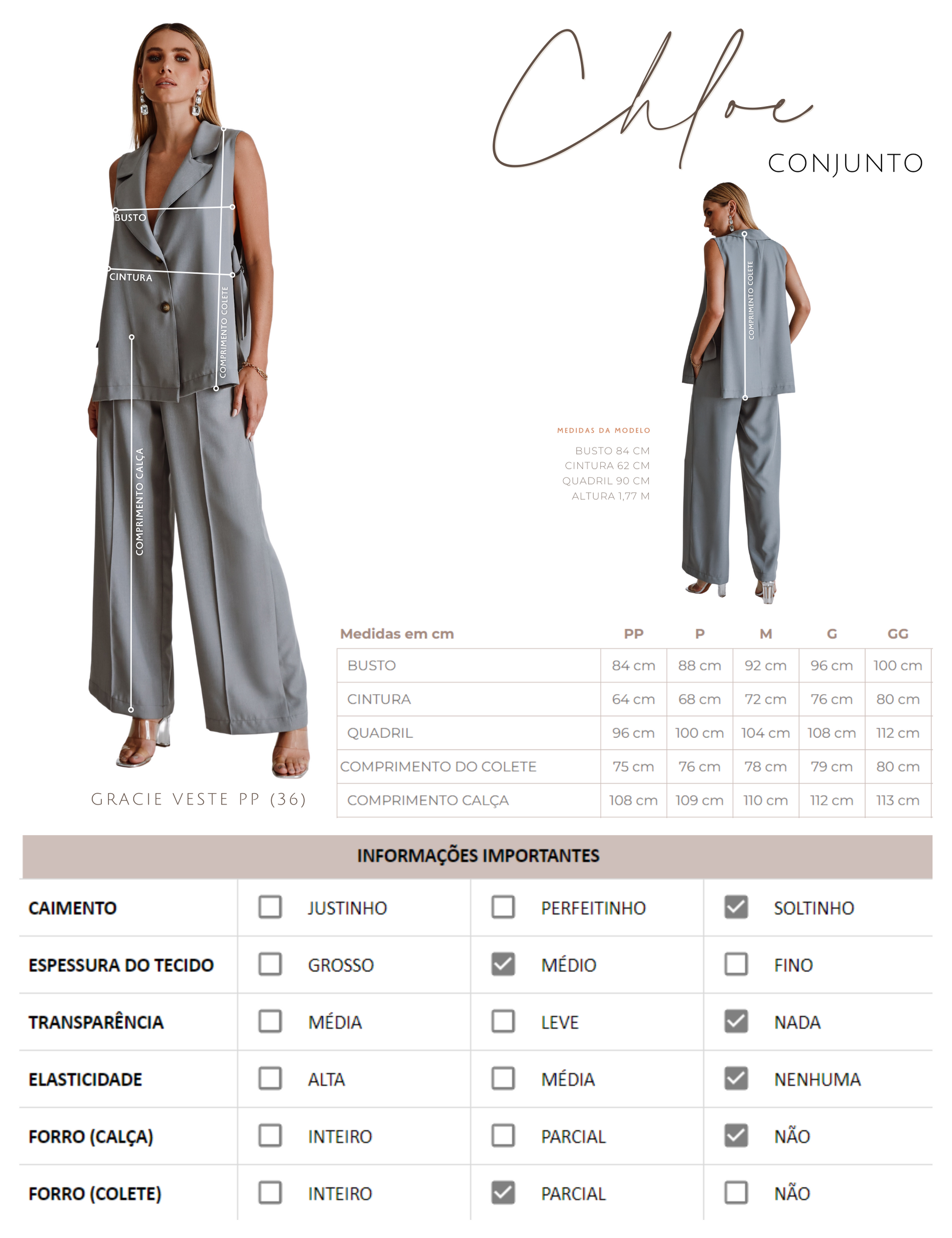 Conjunto confeccionado em alfaiataria. O colete é amplo e alongado, possui fechamento frontal por botões rajados foscos, lateral toda aberta com fechamento por tiras e argolas de metal e lapela dobrada na gola. A calça é pantalona, possui fechamento lateral por zíper invisível, cós largo, vincos frontais e bolsos laterais. O conjunto sofisticado e versátil que não pode faltar no seu guarda-roupas.