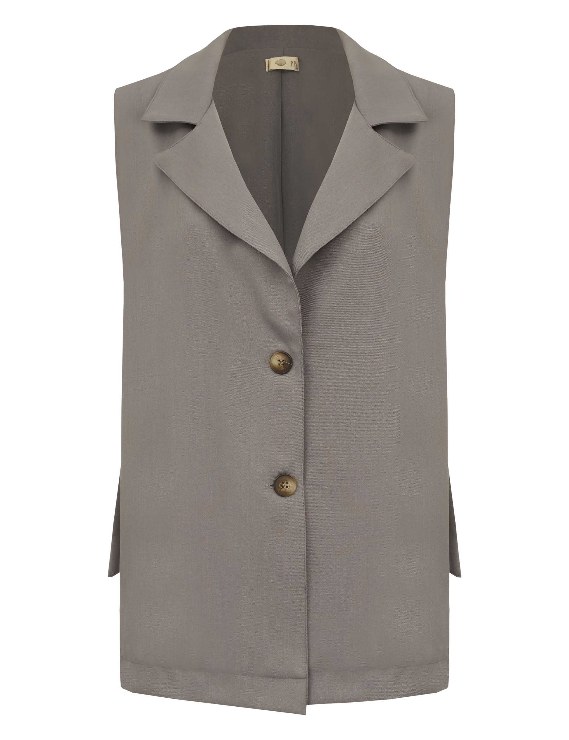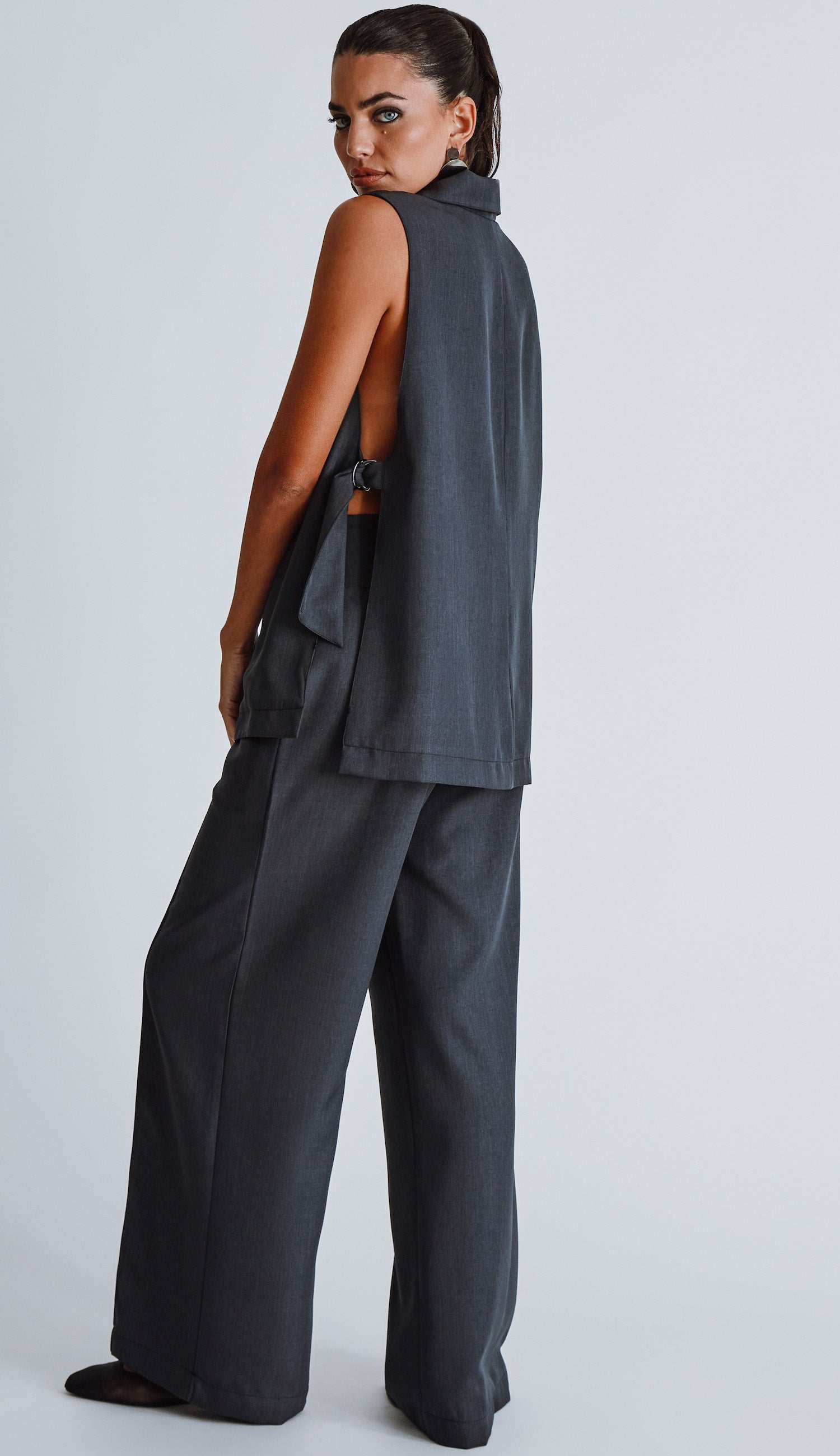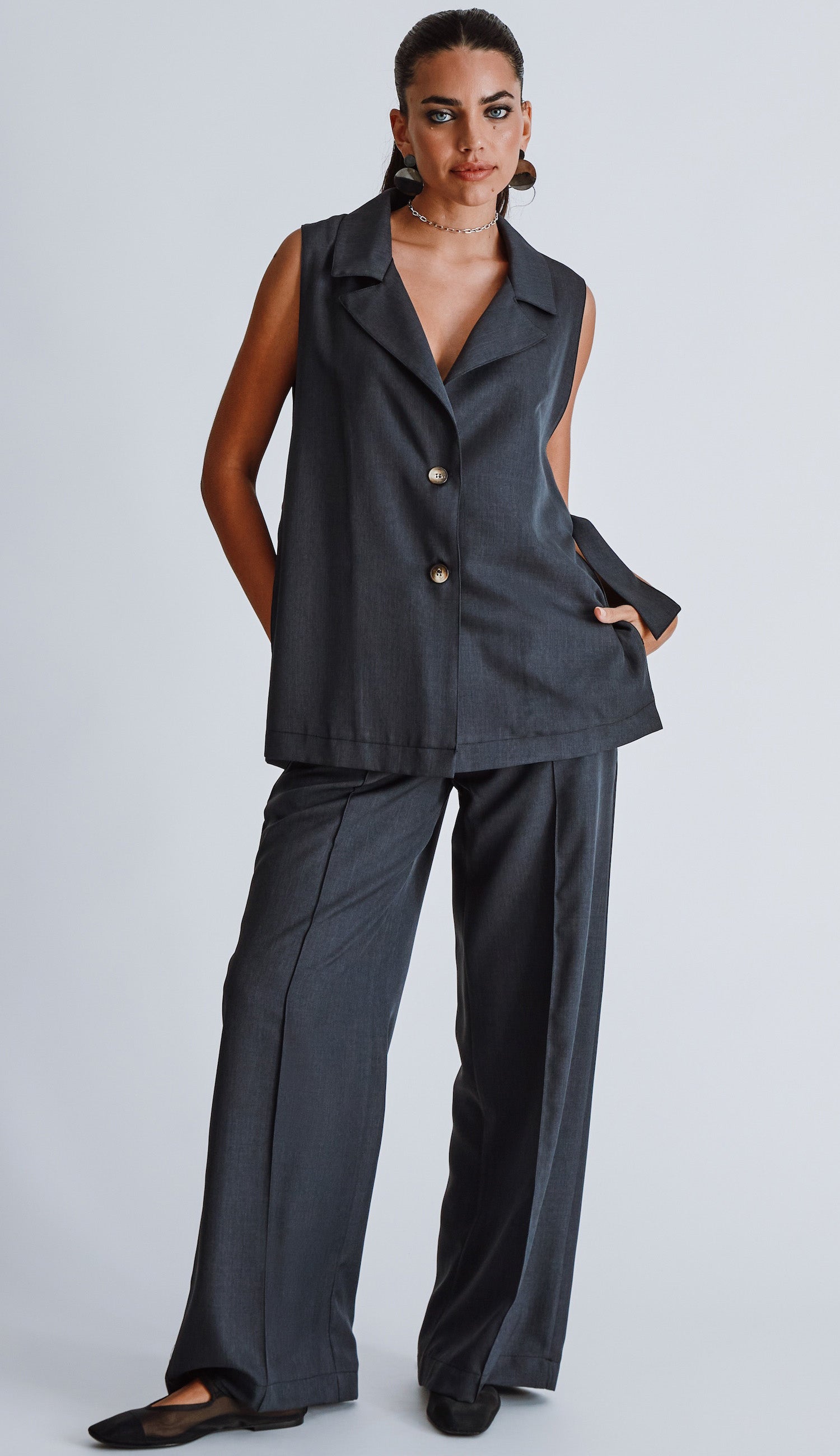 Conjunto confeccionado em alfaiataria. O colete é amplo e alongado, possui fechamento frontal por botões rajados foscos, lateral toda aberta com fechamento por tiras e argolas de metal e lapela dobrada na gola. A calça é pantalona, possui fechamento lateral por zíper invisível, cós largo, vincos frontais e bolsos laterais. O conjunto sofisticado e versátil que não pode faltar no seu guarda-roupas.