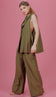 Conjunto com forro, confeccionado em alfaiataria de poliviscose com aspecto de liocel e efeito amassadinho. O colete é amplo e alongado, possui fechamento frontal por botão único forrado, lateral toda aberta com fechamento por tiras e argolas de metal e lapela dobrada na gola. A calça é pantalona, possui fechamento lateral por zíper invisível, cós largo, vincos frontais e bolsos laterais. O conjunto sofisticado e versátil que não pode faltar no seu guarda-roupas.