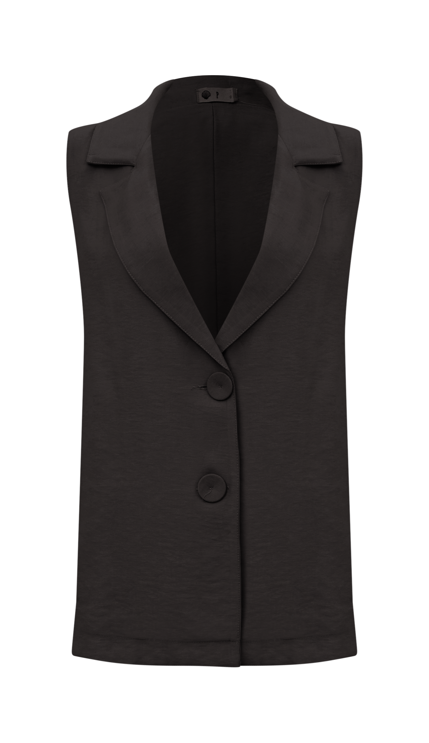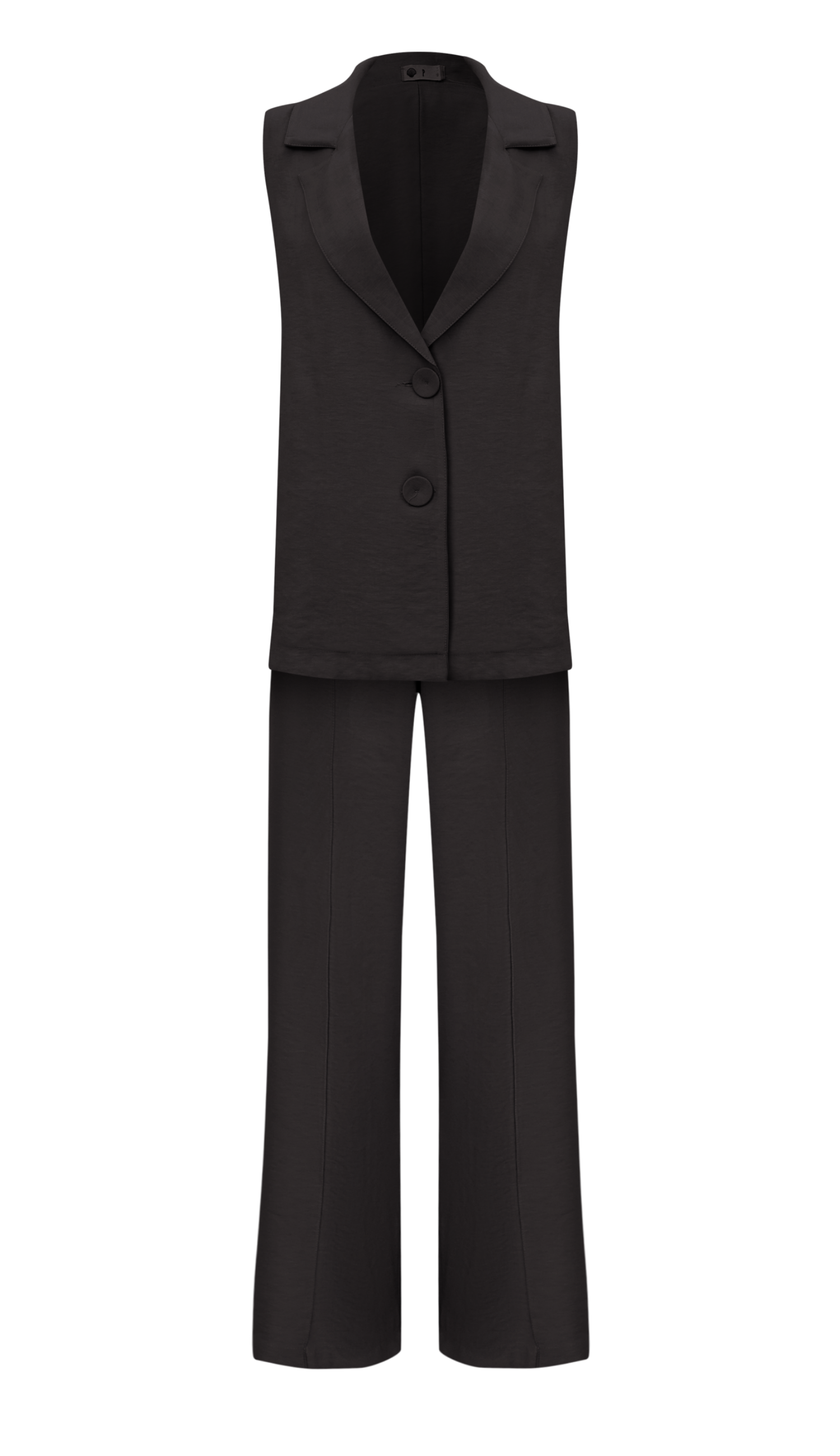 Conjunto confeccionado em sarja de alfaiataria em viscose mais encorpada. O colete é amplo e alongado, possui fechamento frontal por botões forrados, lateral toda aberta com fechamento por tiras e argolas de metal e lapela dobrada na gola. A calça é pantalona, possui fechamento lateral por zíper invisível, cós largo, vincos frontais e bolsos laterais. O conjunto sofisticado e versátil que não pode faltar no seu guarda-roupas.