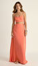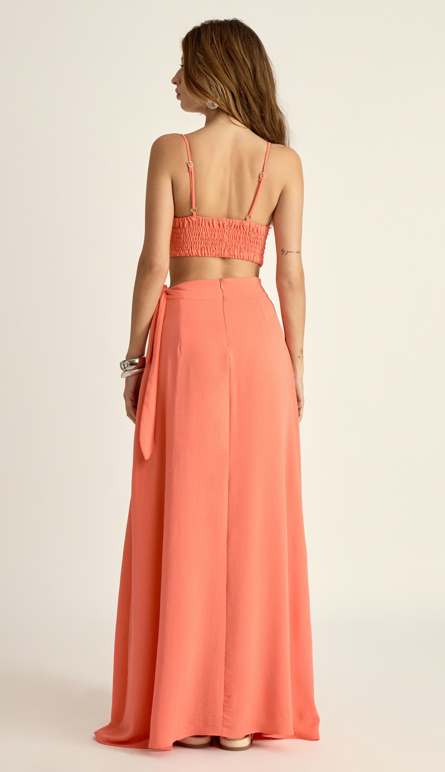 Conjunto com forro, confeccionado em crepe texturizado com efeito amassadinho. O top possui decote coração com pala, preguinhas e recortes que modelam o busto, alcinhas reguláveis, franzidos frontais e lastex franzido nas costas para maior conforto. Saia longa com fechamento traseiro por zíper invisível e detalhe lateral de pequena abertura com faixas fixas no cós para amarração e argola de metal.