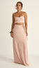 Conjunto com forro, confeccionado em crepe texturizado com efeito amassadinho. O top possui decote coração com pala, preguinhas e recortes que modelam o busto, alcinhas reguláveis, franzidos frontais e lastex franzido nas costas para maior conforto. Saia longa com fechamento traseiro por zíper invisível e detalhe lateral de pequena abertura com faixas fixas no cós para amarração e argola de metal.