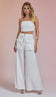 Conjunto com forro confeccionado em viscose encorpado com aspecto de linho. O top é no estilo corset, não possui mangas e conta com decote assimétrico com pontas, silicone interno para maior segurança, recortes frontais com barbatanas que estruturam a peça, barra arredondada e lastex franzido nas costas para maior conforto. A calça possui modelagem pantalona, passantes no cós, bolsos frontais aplicados com lapela e fechamento frontal por zíper de metal com pingente que tem a conchinha da Laguna gravada.