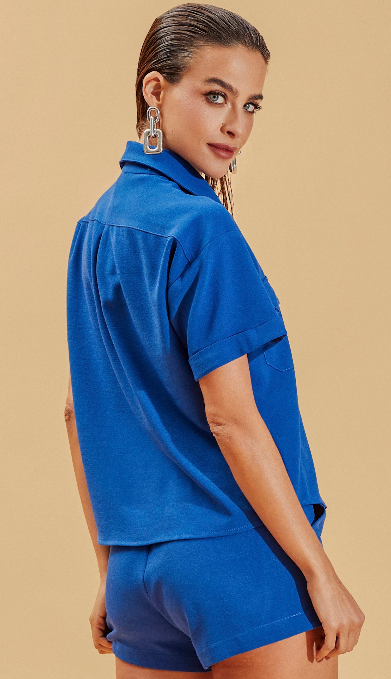 Conjunto confeccionado em crepe de alfaiataria. A camisa possui cava deslocada com mangas curtas dobradinhas, bolsos na frente com lapela e fechamento por botões madre pérola. O shorts é clochard com amarração por cordão, elástico no cós, fechamento frontal por zíper, bolsos aplicados e barra larguinha. É o conjunto perfeito para ficar arrumada para o dia-a-dia.