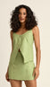 Conjunto confeccionado em sarja de alfaiataria em poliviscose mais encorpada com aspecto amassadinho. A blusa possui forro, modelagem de colete mais soltinha e mais alongada, possui decote em U mais profundo, alças com reguladores de metal, fechamento frontal por botões forrados até a metade da peça, recortes pespontados que modelam a silhueta e abertura frontal que dá um detalhe charmoso deixando a peça de baixo à mostra. O shorts saia possui modelagem ajustada, sobreposição de tecido, passantes, recortes pespontados que alongam a silhueta, bolsos laterais e fechamento traseiro por zíper invisível.