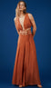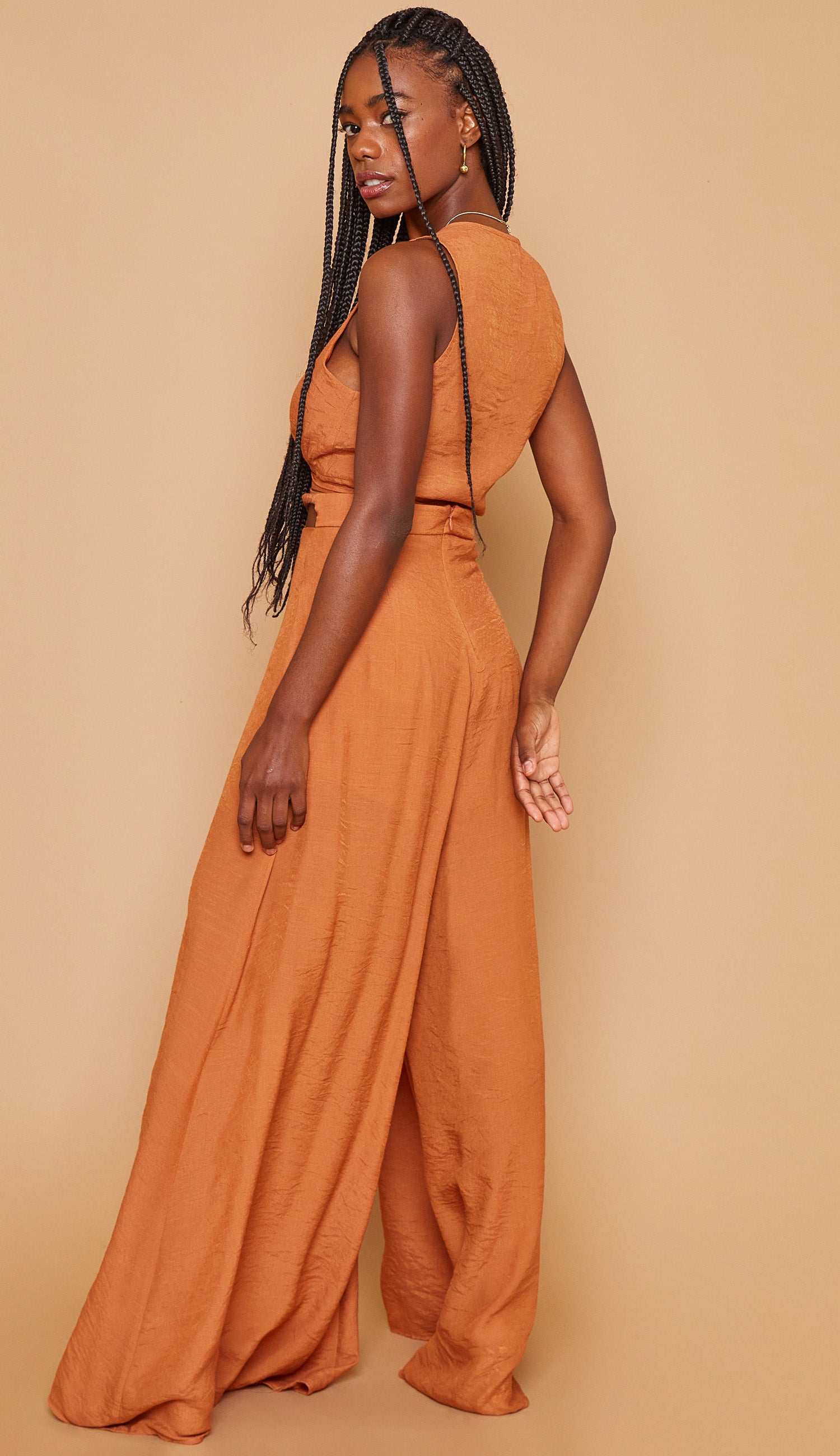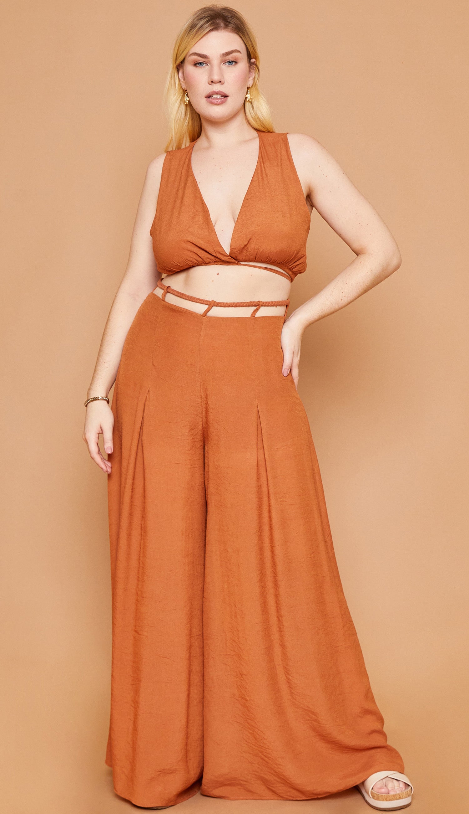 Conjunto com forro, confeccionado em poliviscose texturizado com aspecto de linho. A regata top é aberta na frente, com transpasse em V no decote, fechamento por tirinhas na barra para amarração. A calça é pantalona com fechamento traseiro por zíper invisível. Possui pregas frontais e detalhe de tiras finas vazadas com cordão na cintura.