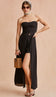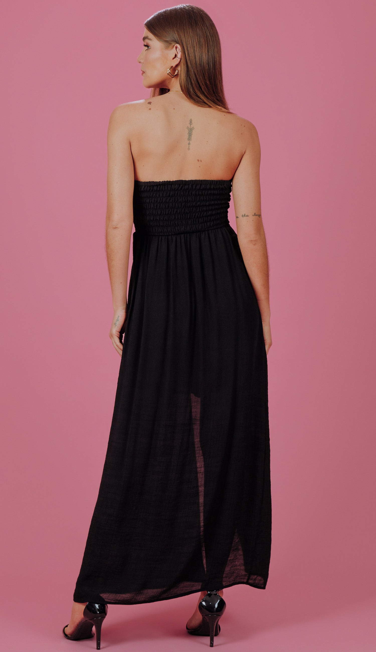 Conjunto com forro, confeccionado em poliviscose texturizado com aspecto de linho. O vestido é longo e não tem mangas; possui decote coração com silicone interno para maior conforto, recortes que modelam o busto, pala na cintura com barbatanas para estruturar a peça, lastex nas costas para maior conforto e fenda frontal deixando a parte de baixo à mostra. O shorts possui modelagem soltinha, pala no cós e fechamento lateral por zíper invisível.