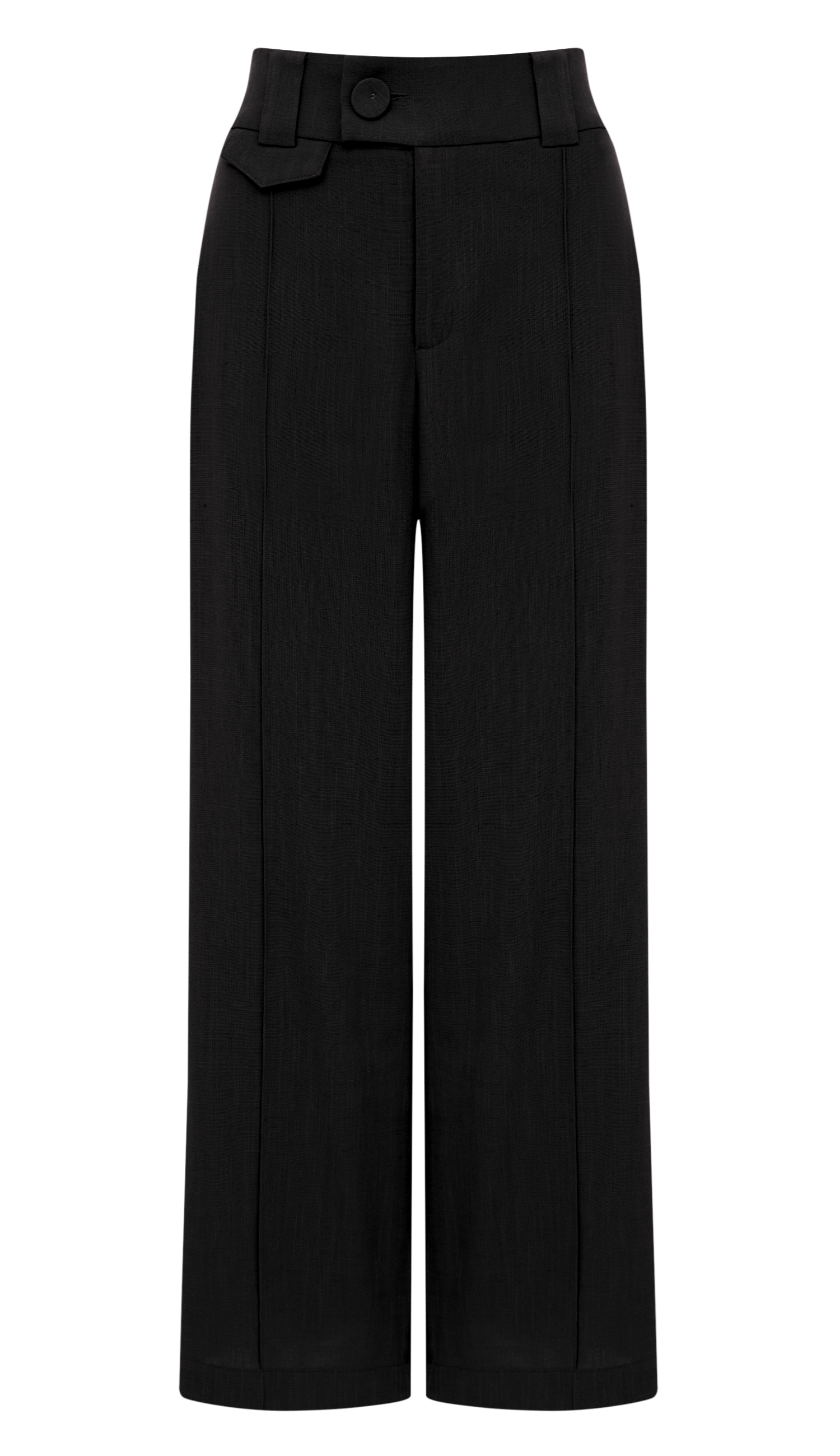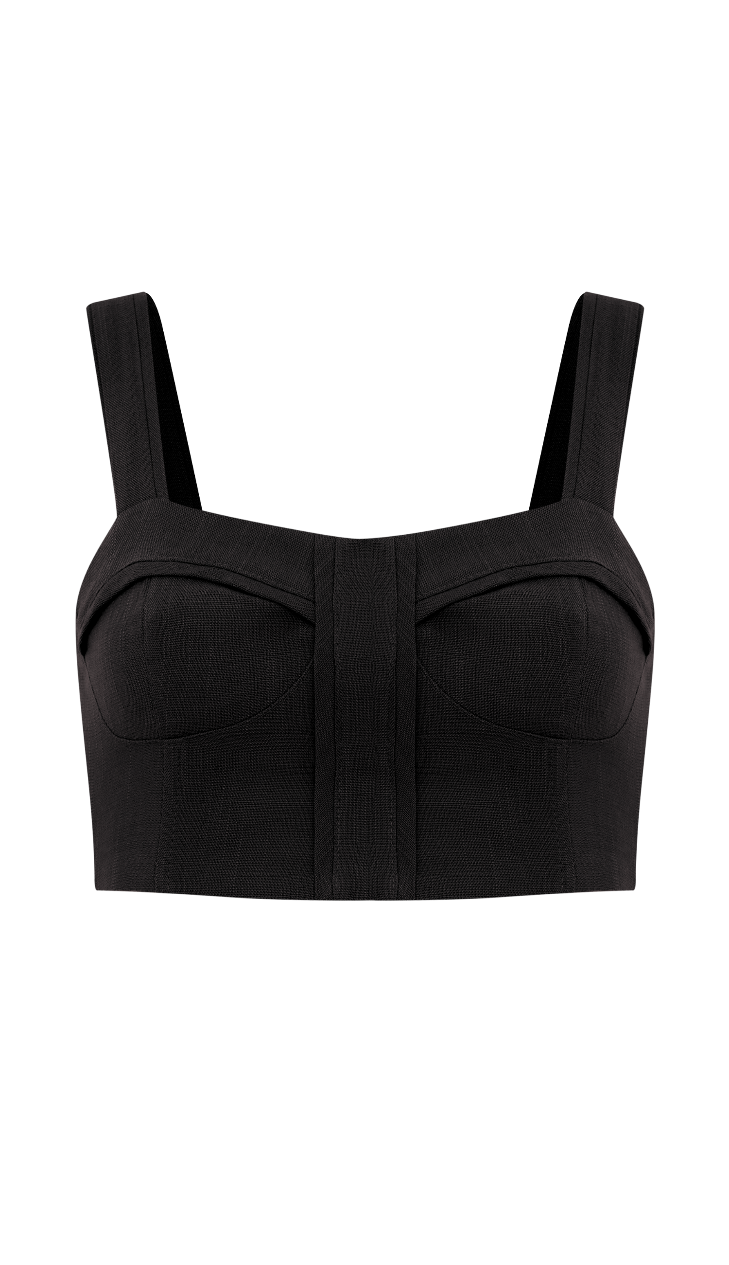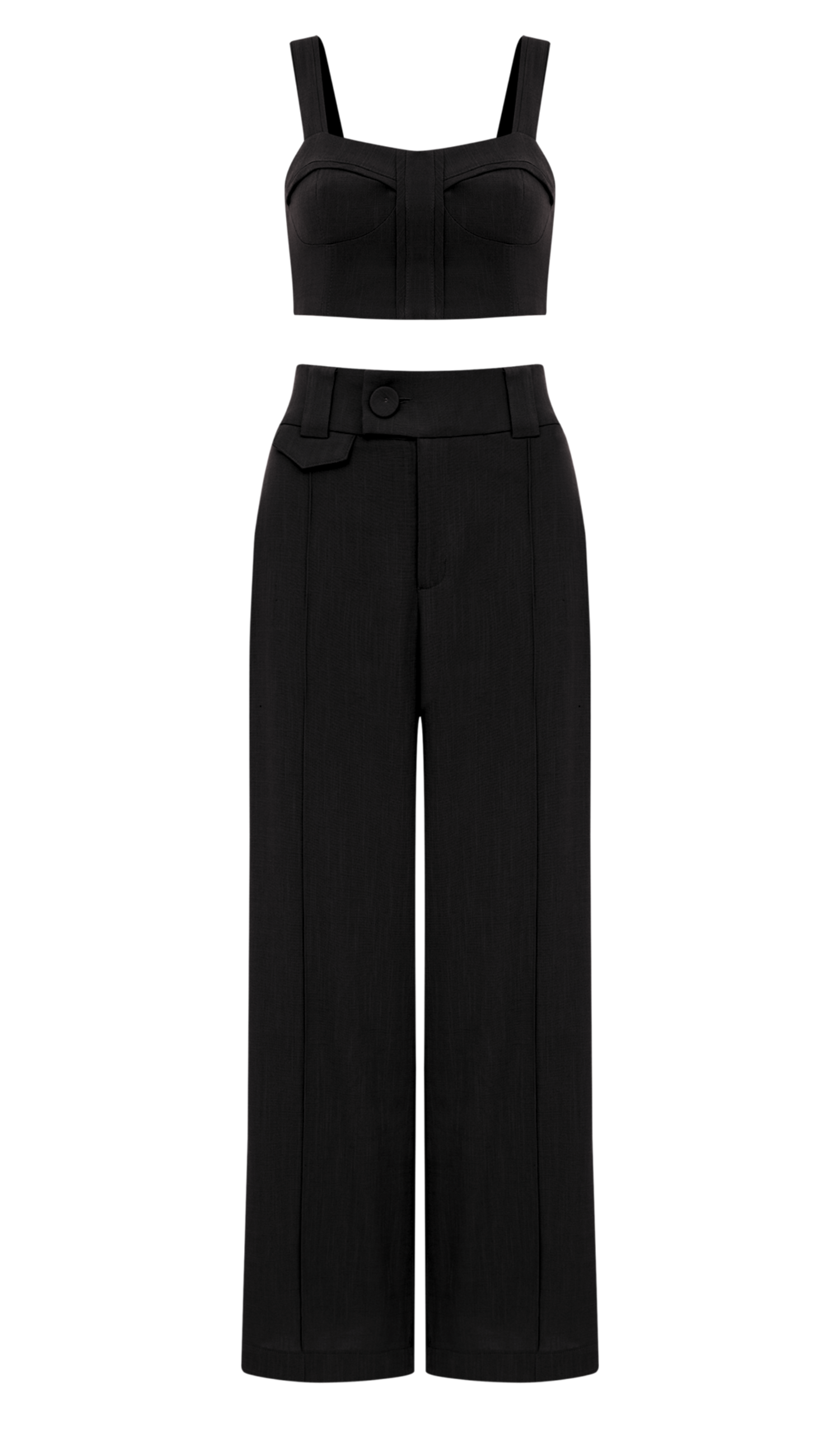 Conjunto confeccionado em linho texturizado mais encorpadinho com forro. O top possui decote coração com recortes que modelam o busto, alças mais grossas com reguladores de metal, barbatanas abaixo do busto para estruturar a peça e lastex franzido nas costas para melhor ajuste ao corpo. A calça é no estilo alfaiataria e modelagem wide, possui fechamento frontal por zíper, botão interno e botão grande forrado deslocado, passantes no cós, vincos frontais e detalhe de lapela.