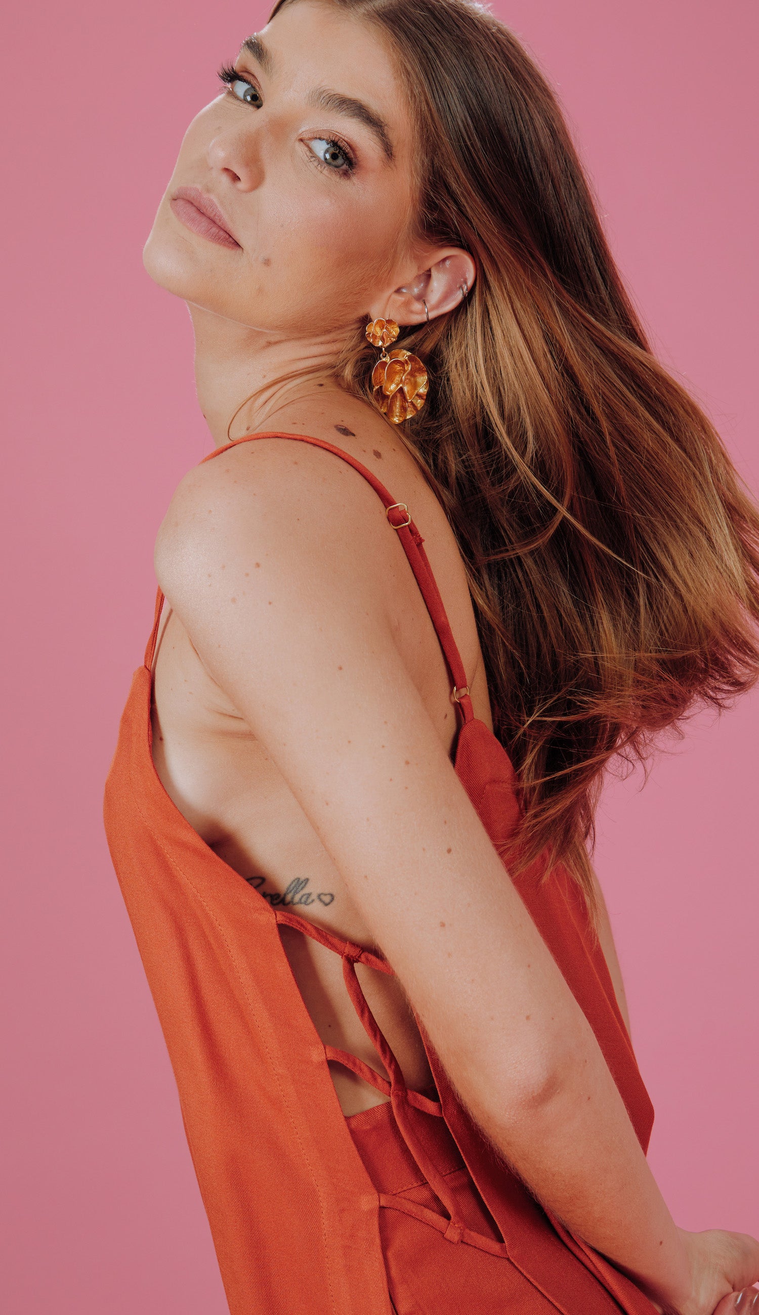 Conjunto confeccionado em viscose twill. A blusa possui decote reto, alcinhas finas reguláveis, aberturas laterais com tirinhas e modelagem mais alongada. O shorts possui fechamento lateral por zíper invisível.