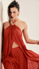 Conjunto confeccionado em poliviscose texturizado com aspecto de linho. O vestido é frente única com argola de metal no decote seguido de franzidinhos, tirinha para amarrar no pescoço e faixa para amarrar na cintura. Possui abertura frontal e detalhe em lastex nas costas para maior conforto. A calça é pantacourt com forro e na lateral possui fechamento por zíper invisível e bolsos.