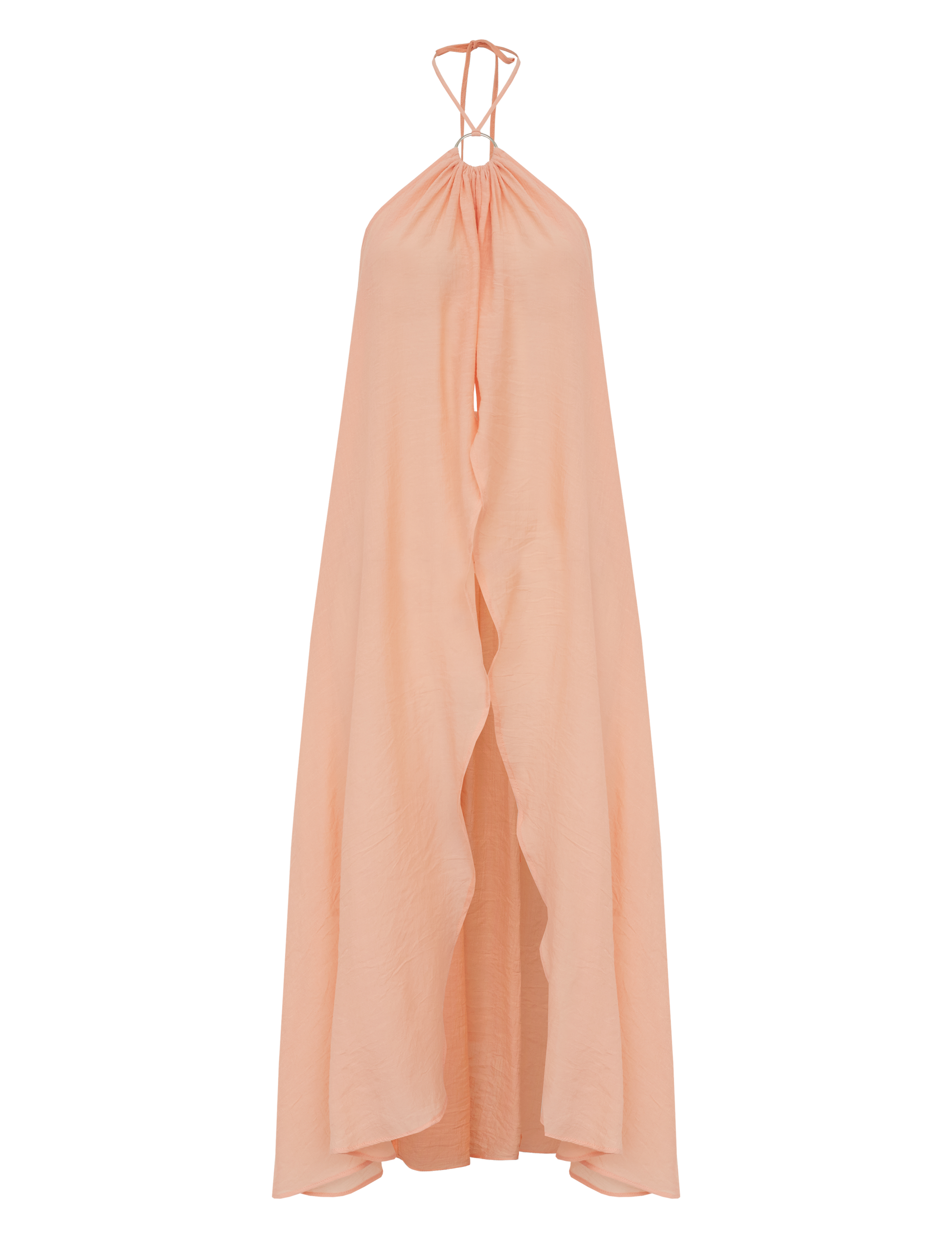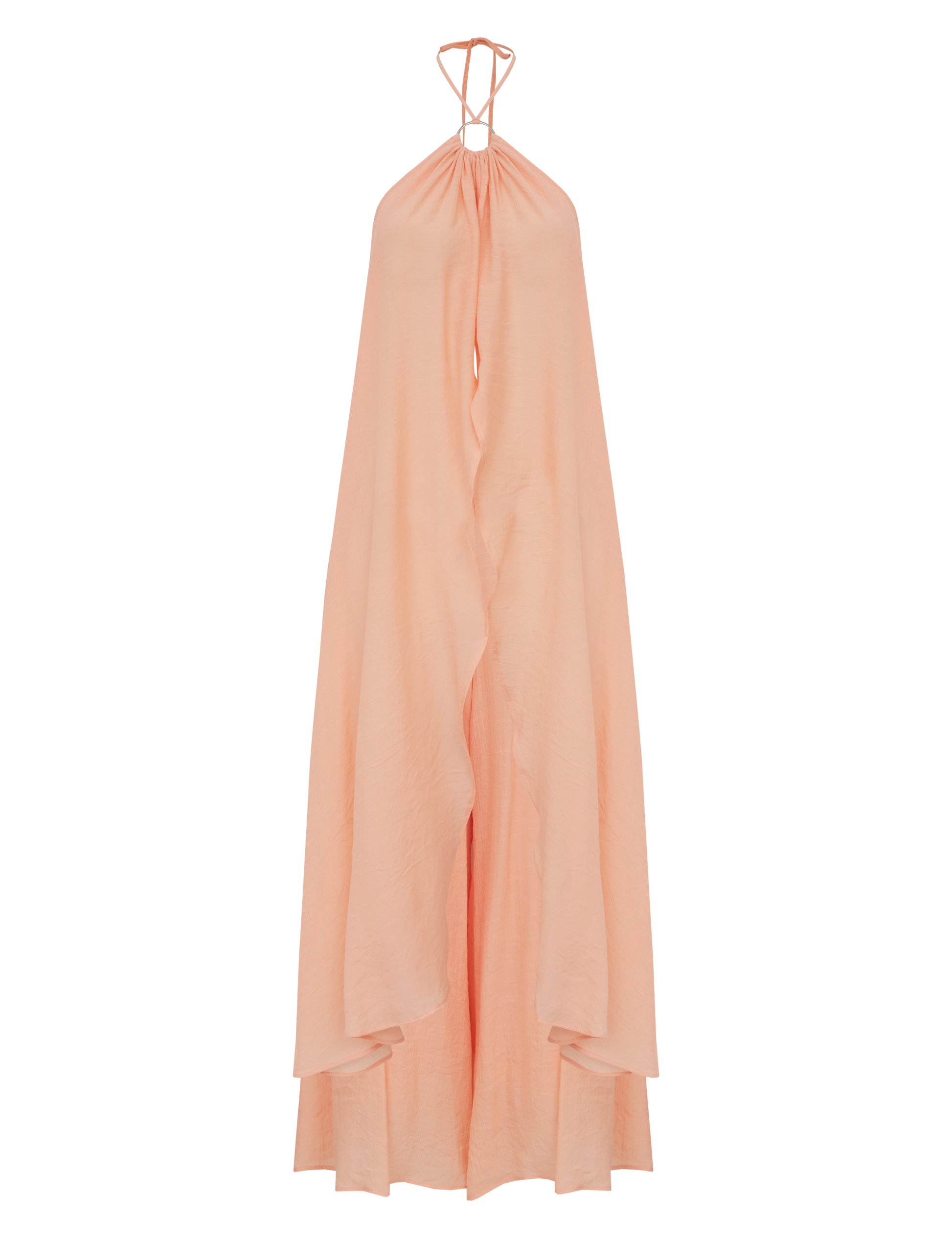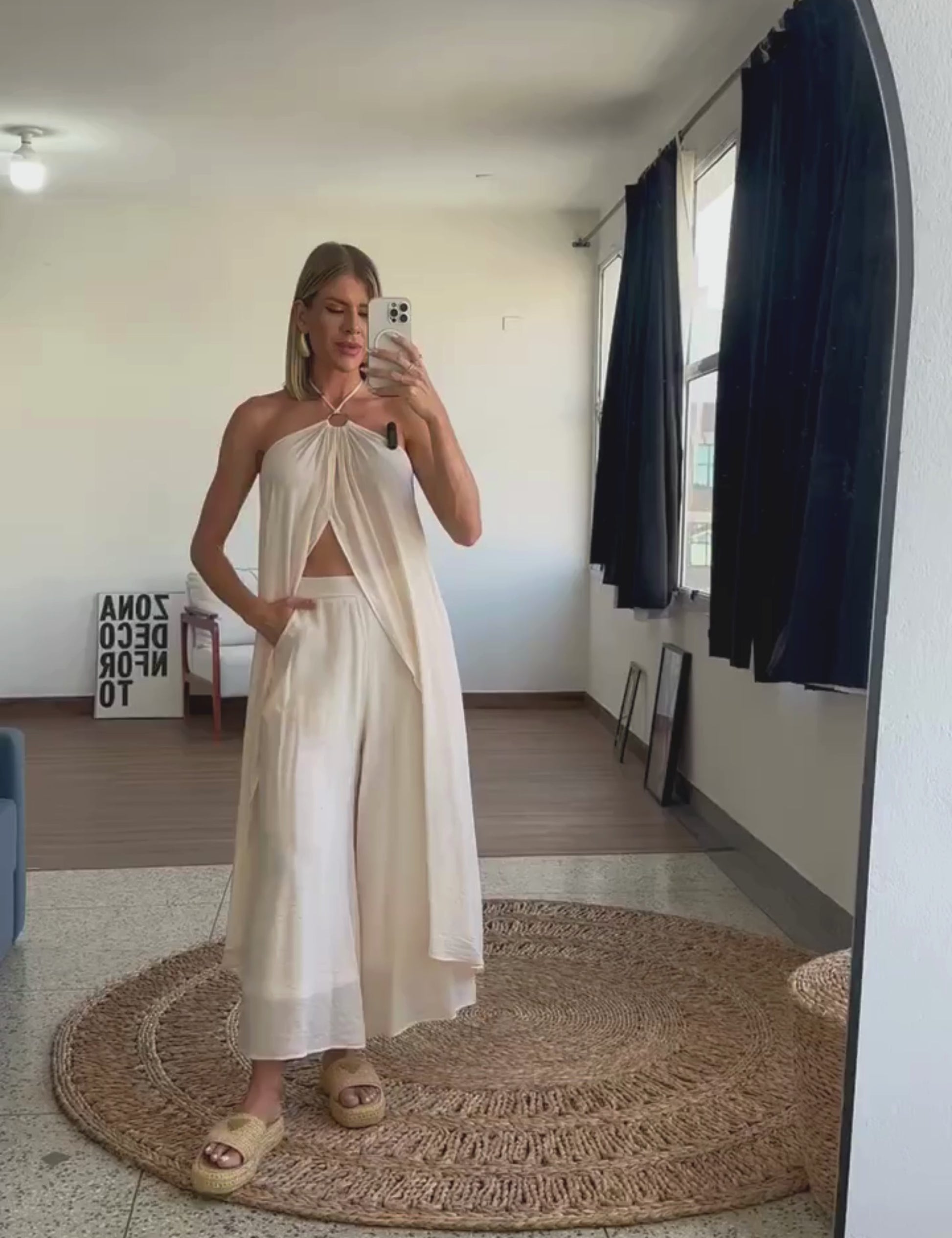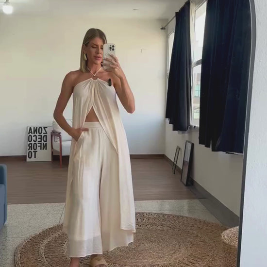Conjunto confeccionado em poliviscose texturizado com aspecto de linho. O vestido é frente única com argola de metal no decote seguido de franzidinhos, tirinha para amarrar no pescoço e faixa para amarrar na cintura. Possui abertura frontal e detalhe em lastex nas costas para maior conforto. A calça é pantacourt com forro e na lateral possui fechamento por zíper invisível e bolsos.