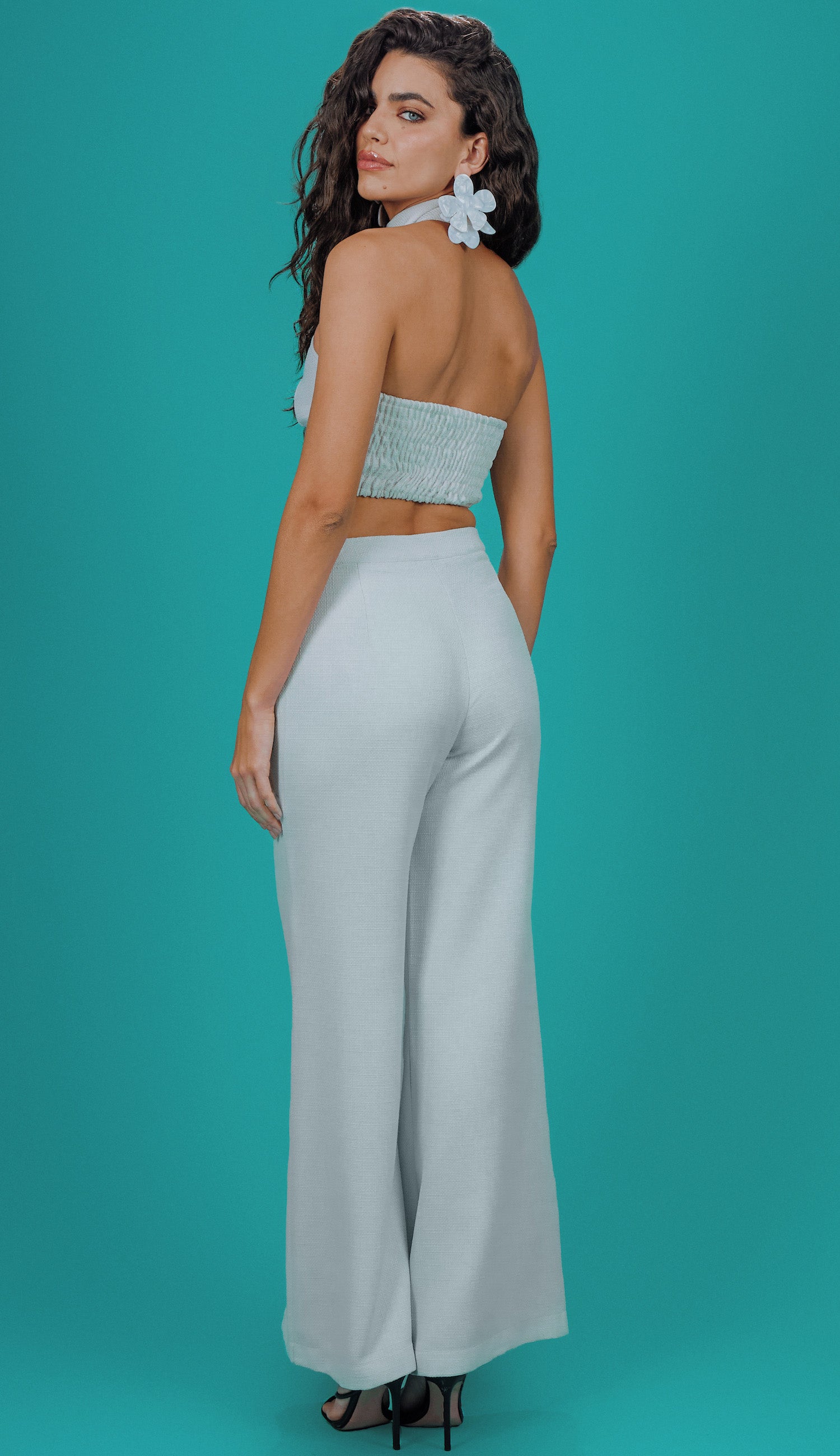 Conjunto confeccionado em tweed encorpado. O top é frente única e possui forro, decote halter com gola alta e fechamento na nuca por botões esmaltados, recortes que modelam o busto, detalhe de recorte vazado na frente, pala abaixo do busto e lastex franzido nas costas para melhor ajuste ao corpo. A calça é pantalona e possui fechamento frontal por zíper de metal com detalhe de conchinha da Laguna gravado no metal do pingente, o que dá um charme todo especial à peça. Ainda conta com vincos frontais, recortes laterais arredondados com cordão revestido nos quadris e detalhes vazados.