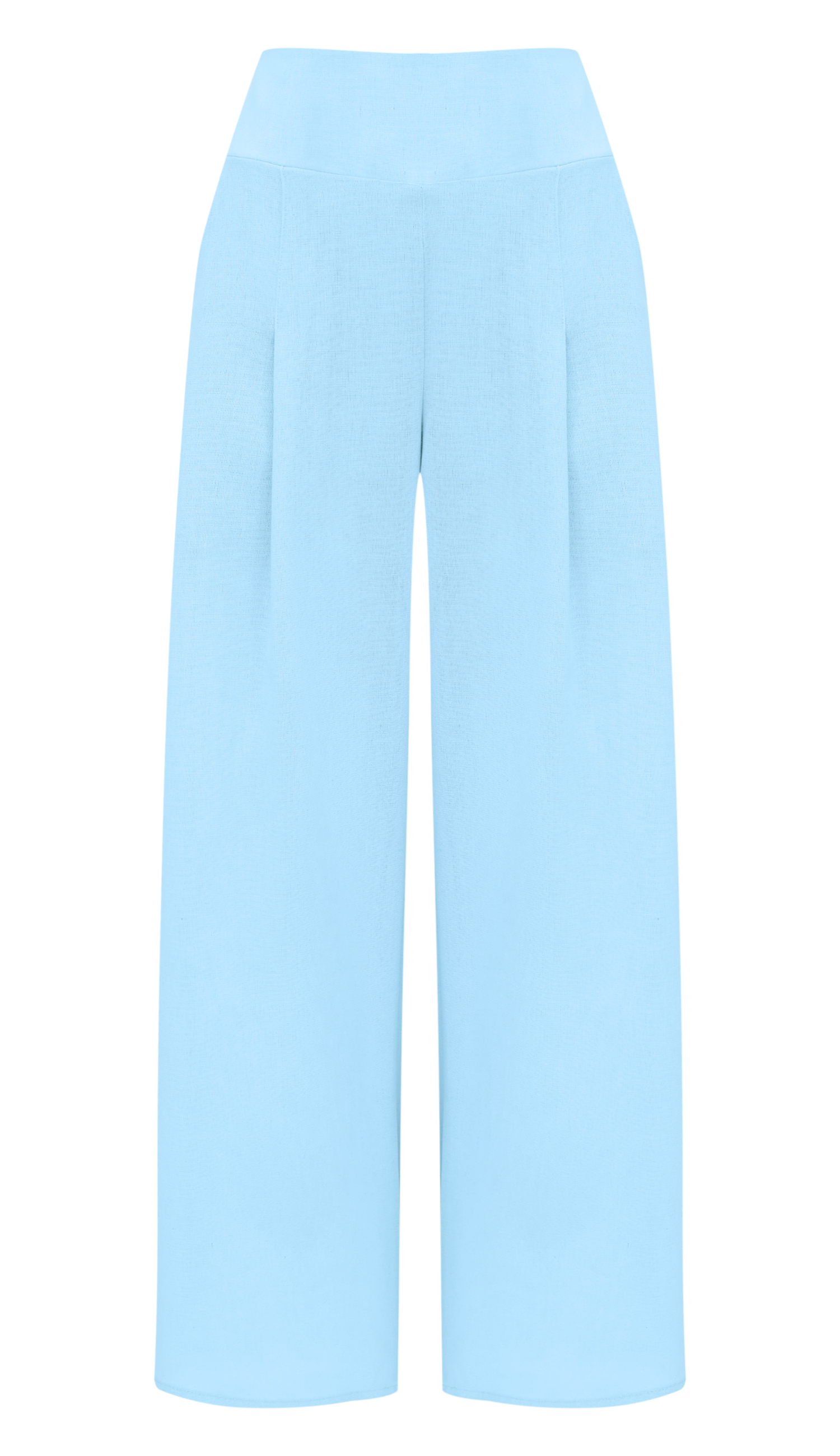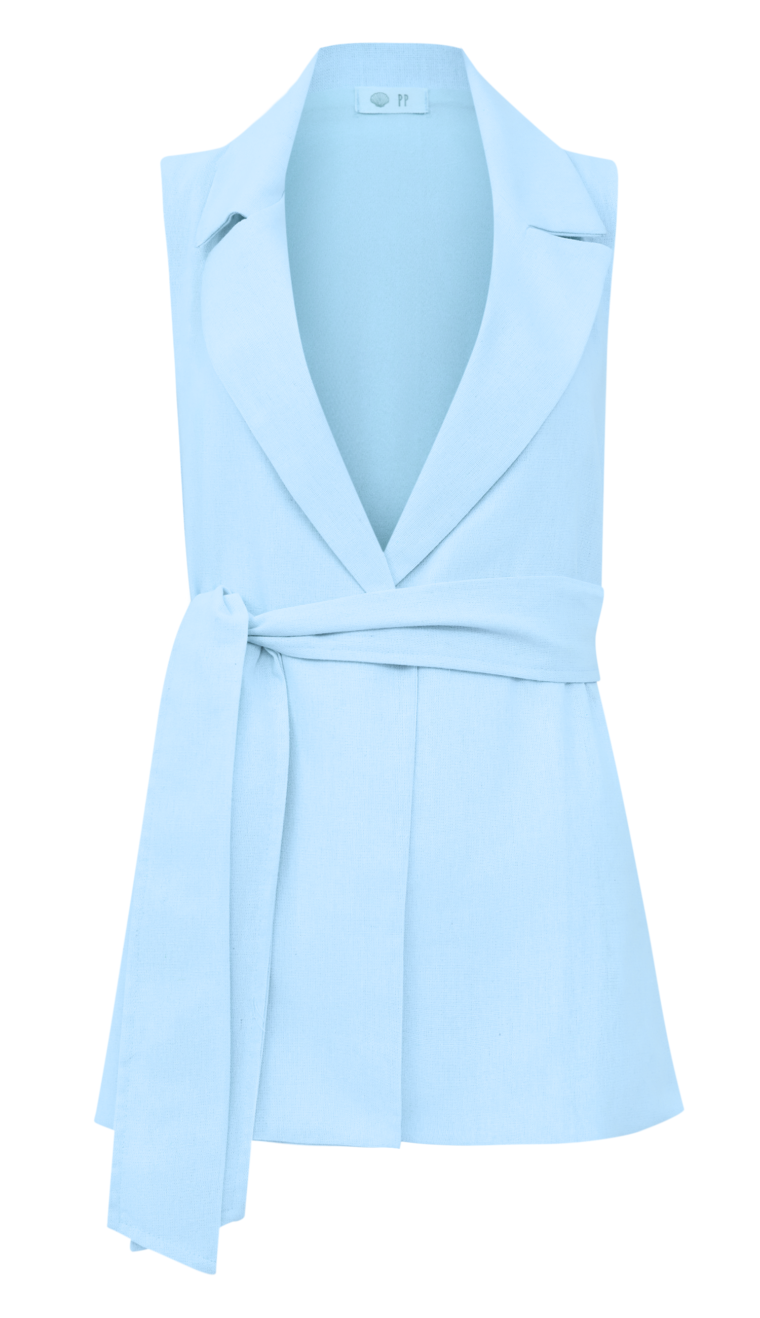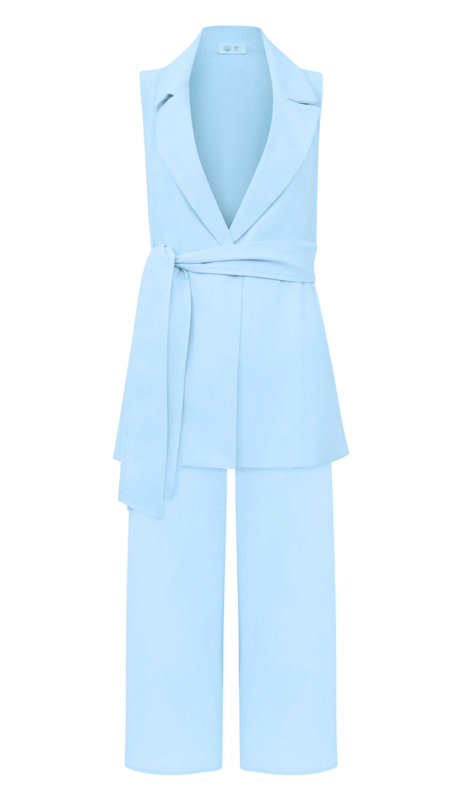 Conjunto confeccionado em linho com forro. O colete é aberto, sem fechamento e possui modelagem alongada e ampla, bolsos laterais, passantes na cintura e faixa solta pespontada para amarrar. A calça é pantalona, possui cós largo, bolsos laterais, pregas frontais e fechamento lateral por zíper invisível.