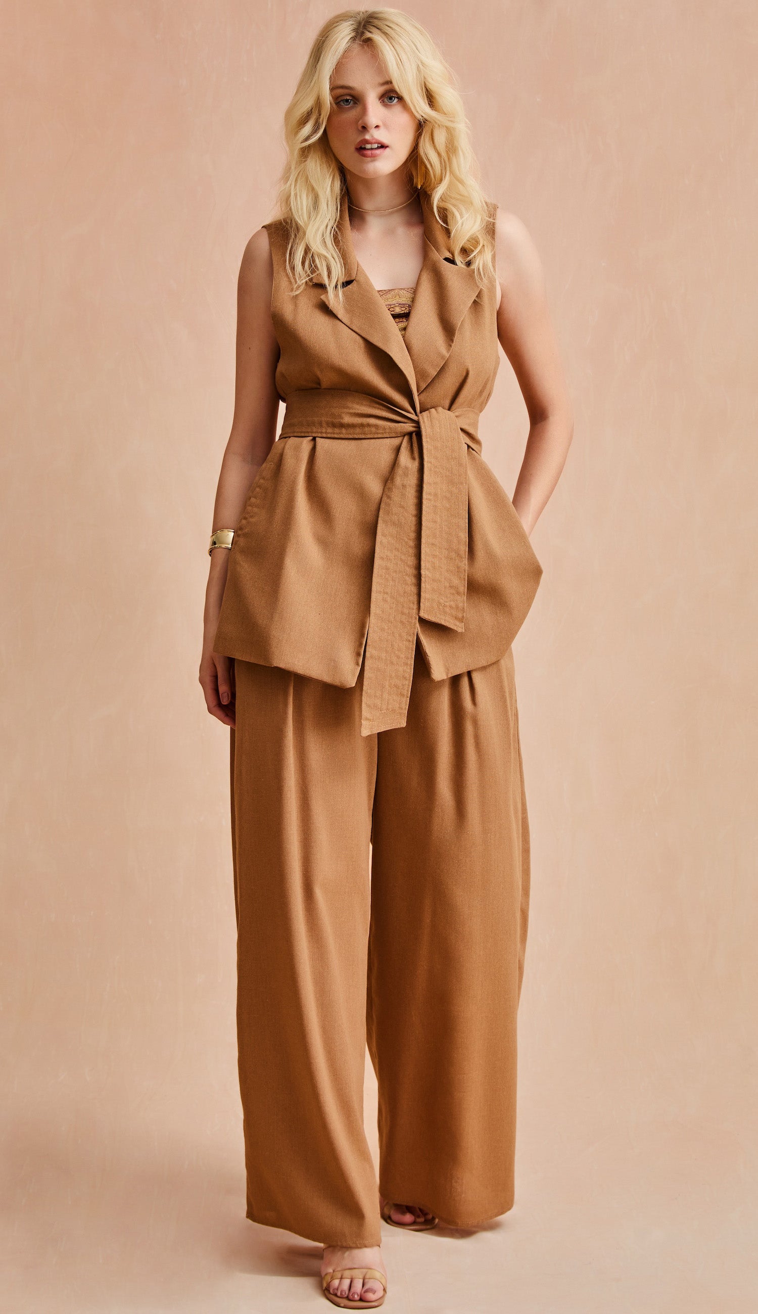 Conjunto confeccionado em linho com forro. O colete é aberto, sem fechamento e possui modelagem alongada e ampla, bolsos laterais, passantes na cintura e faixa solta pespontada para amarrar. A calça é pantalona, possui cós largo, bolsos laterais, pregas frontais e fechamento lateral por zíper invisível.