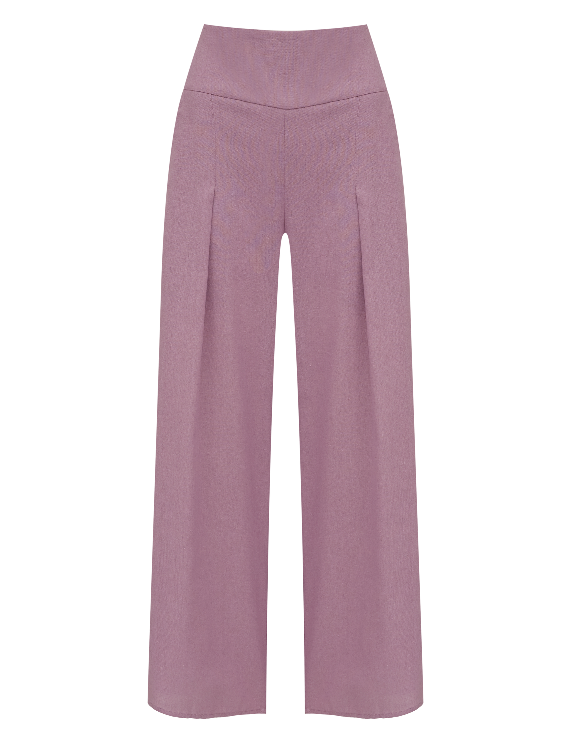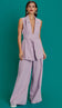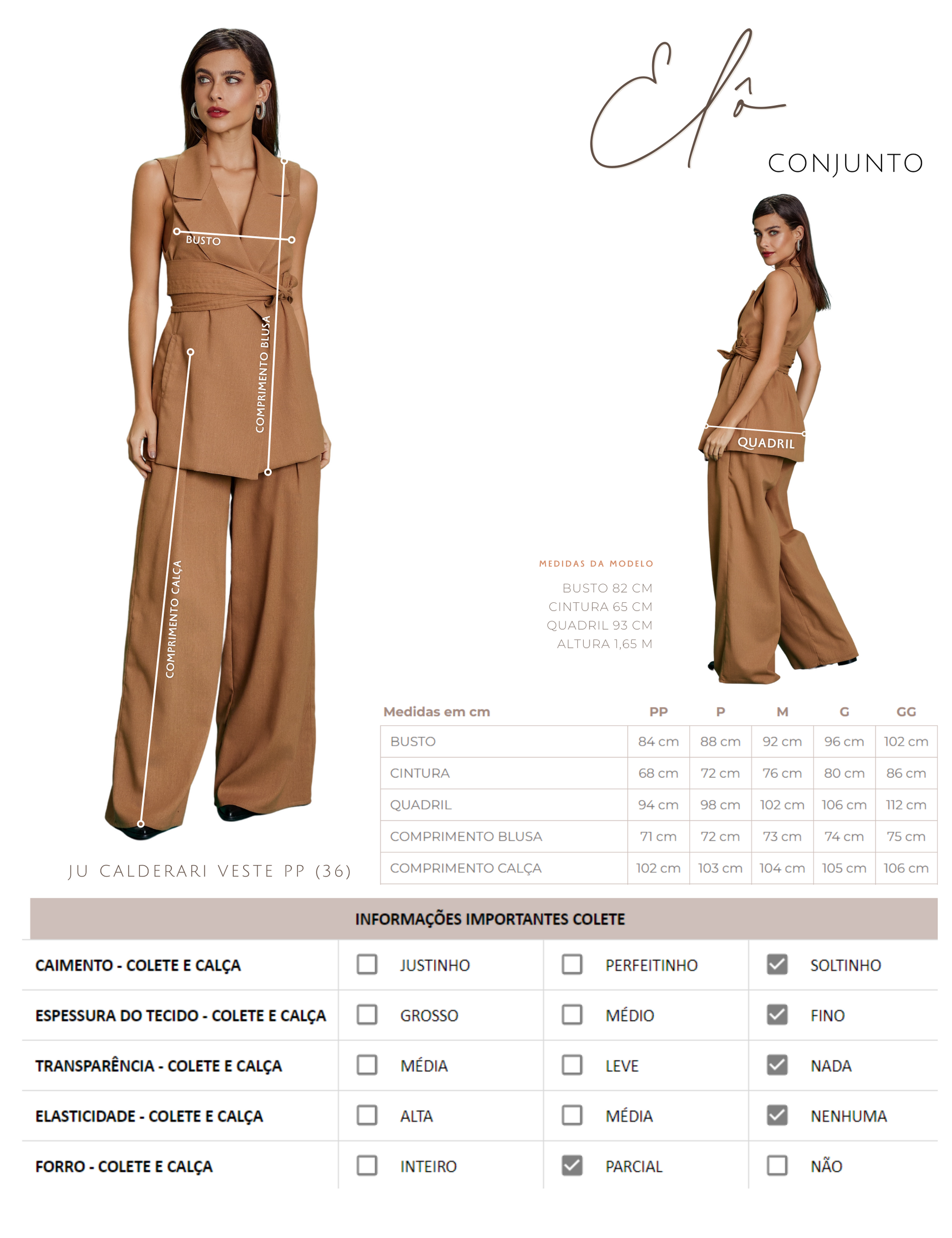 Conjunto confeccionado em linho com forro. O colete é aberto, sem fechamento e possui modelagem alongada e ampla, bolsos laterais, passantes na cintura e faixa solta pespontada para amarrar. A calça é pantalona, possui cós largo, bolsos laterais, pregas frontais e fechamento lateral por zíper invisível.