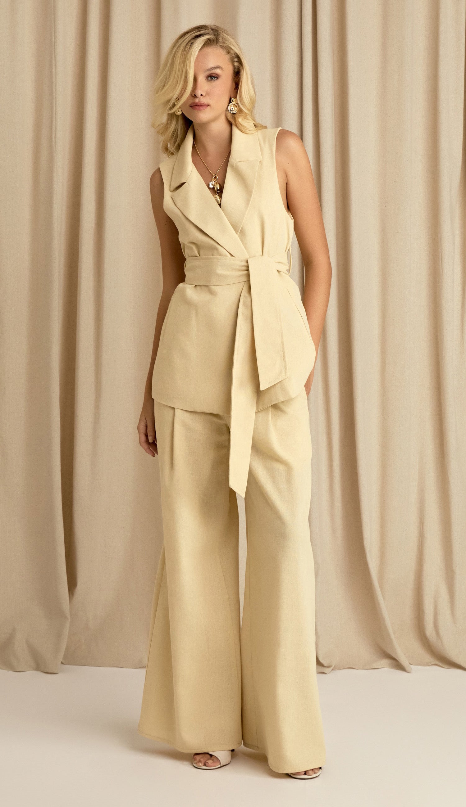 Conjunto confeccionado em linho com forro. O colete é aberto, sem fechamento e possui modelagem alongada e ampla, bolsos laterais, passantes na cintura e faixa solta pespontada para amarrar. A calça é pantalona, possui cós largo, bolsos laterais, pregas frontais e fechamento lateral por zíper invisível.