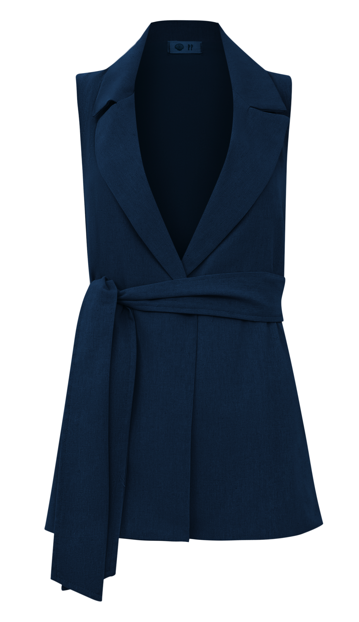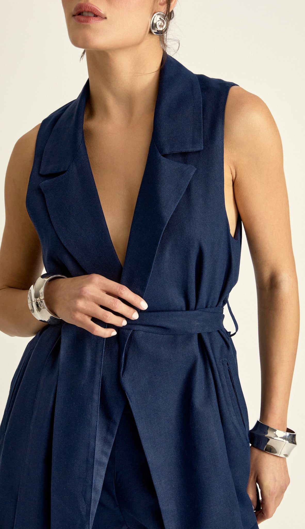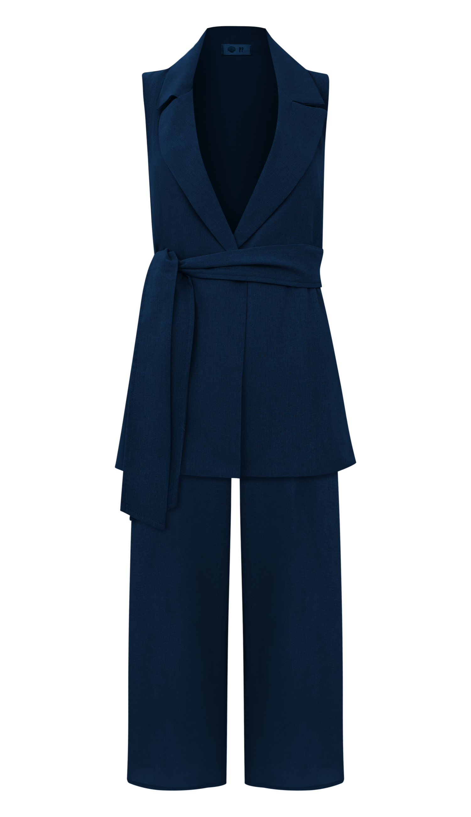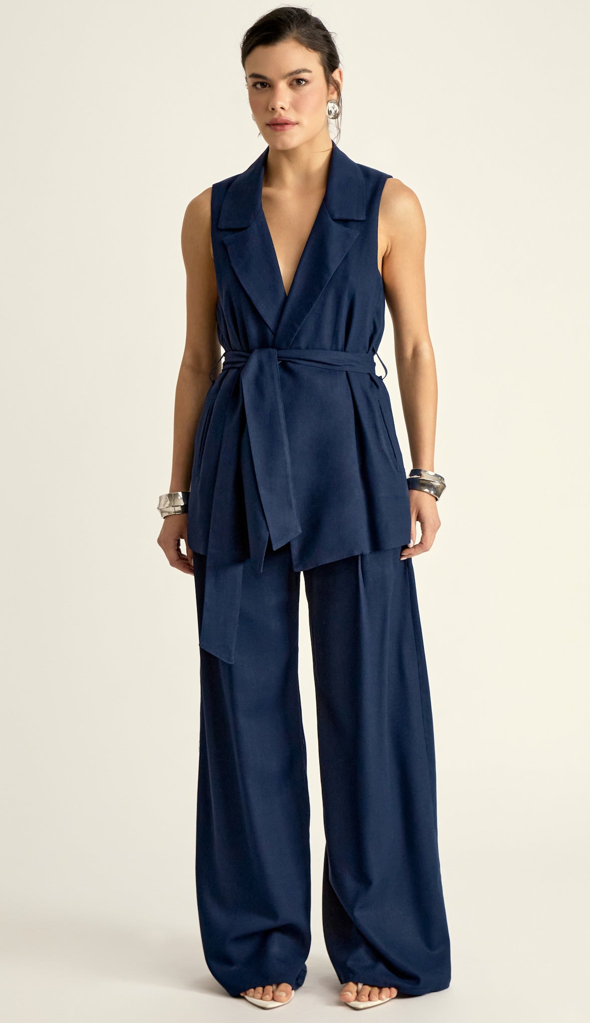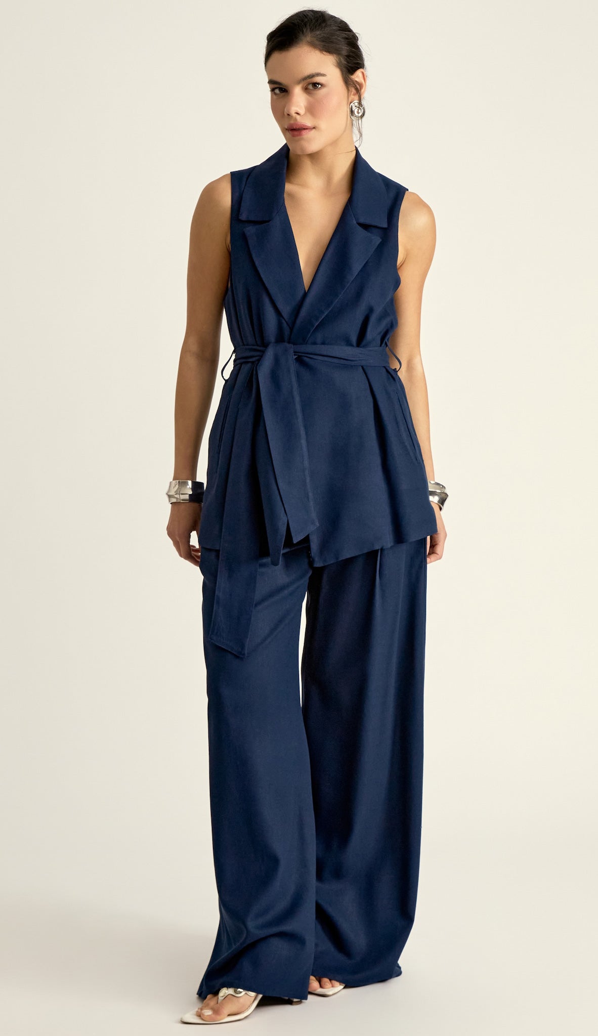 Conjunto confeccionado em linho com forro. O colete é aberto, sem fechamento e possui modelagem alongada e ampla, bolsos laterais, passantes na cintura e faixa solta pespontada para amarrar. A calça é pantalona, possui cós largo, bolsos laterais, pregas frontais e fechamento lateral por zíper invisível.
