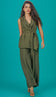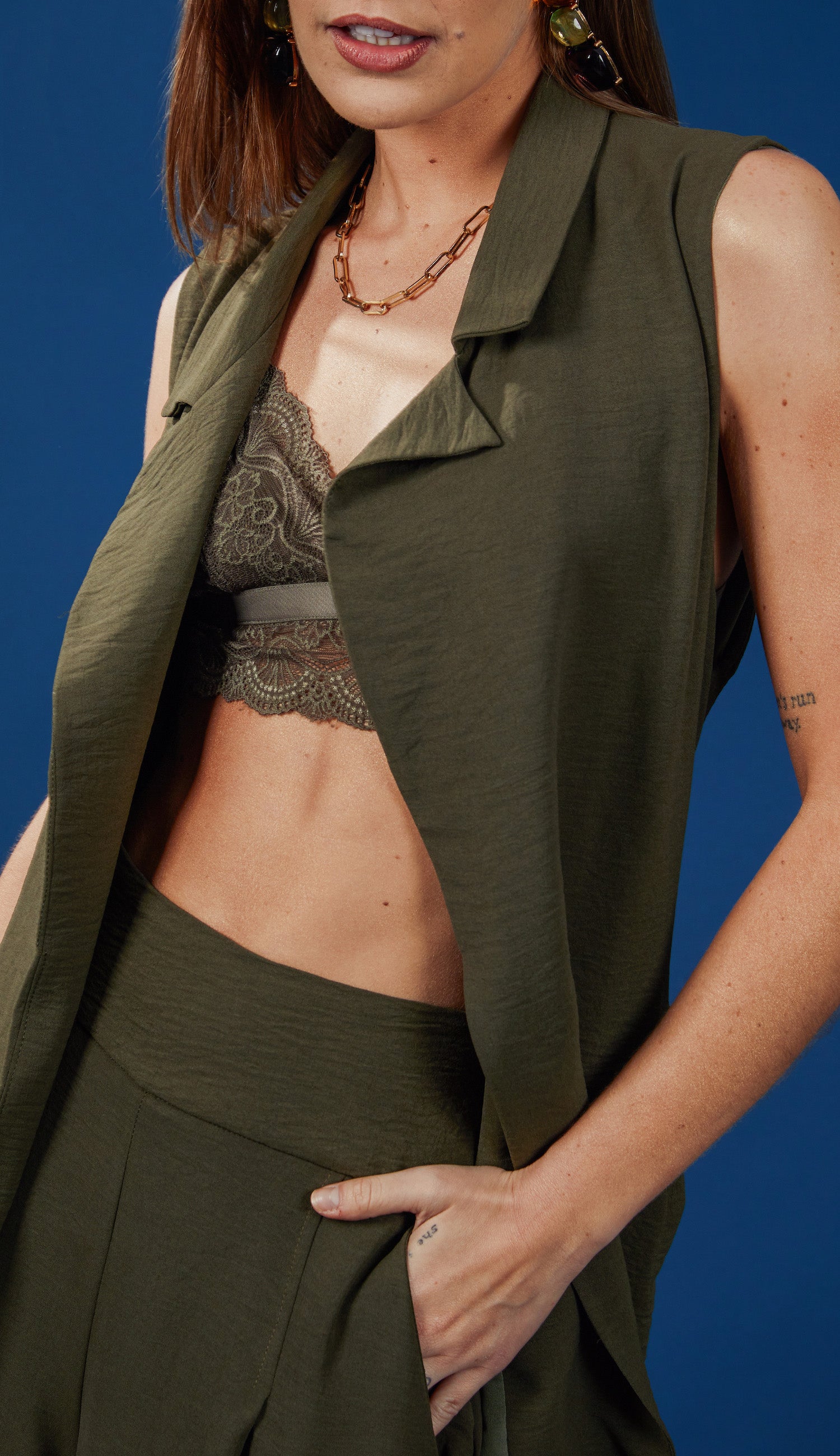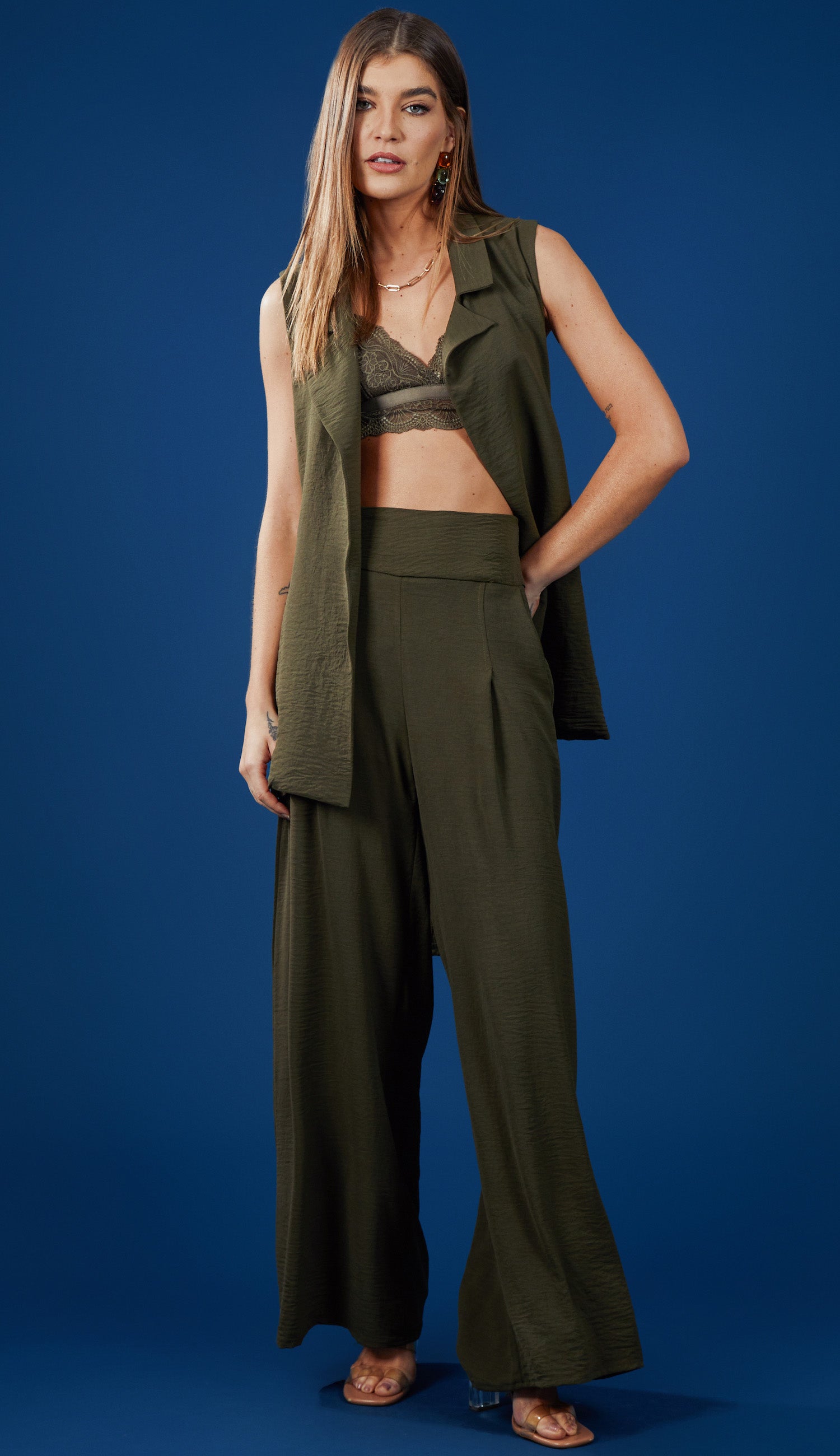 Conjunto com forro, confeccionado em crepe texturizado com efeito amassadinho. O colete é aberto, sem fechamento e possui modelagem alongada e ampla, bolsos laterais, passantes na cintura e faixa solta pespontada para amarrar. A calça é pantalona, possui cós largo, bolsos laterais, pregas frontais e fechamento lateral por zíper invisível.