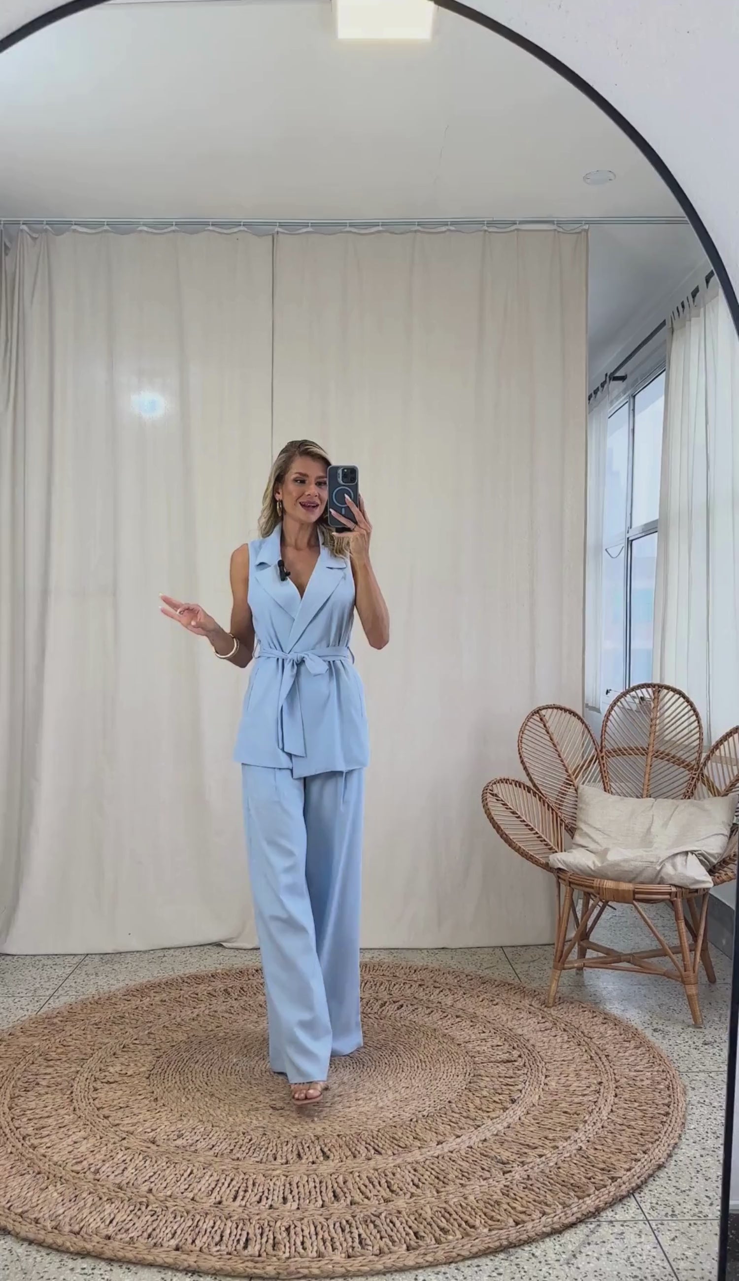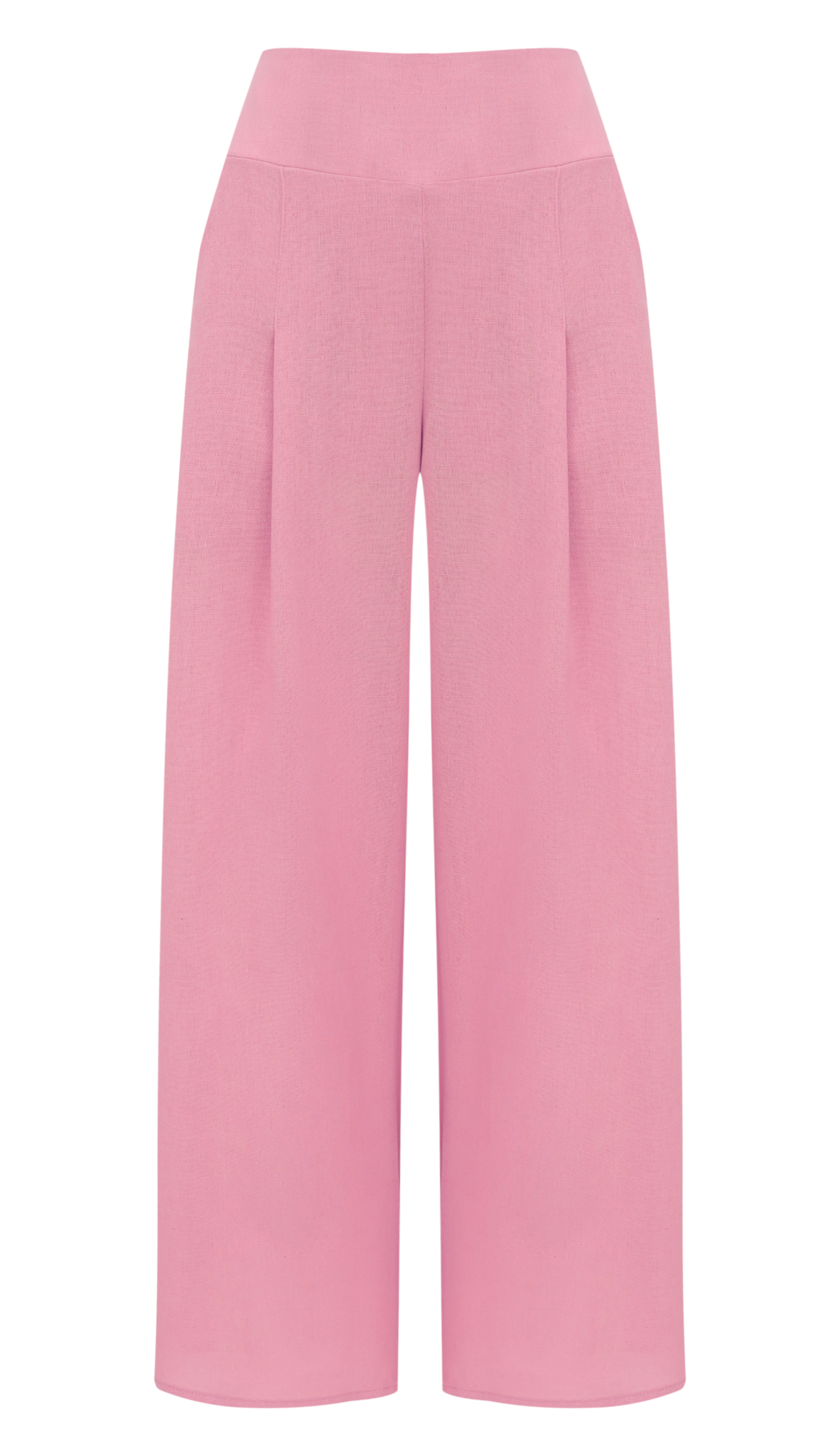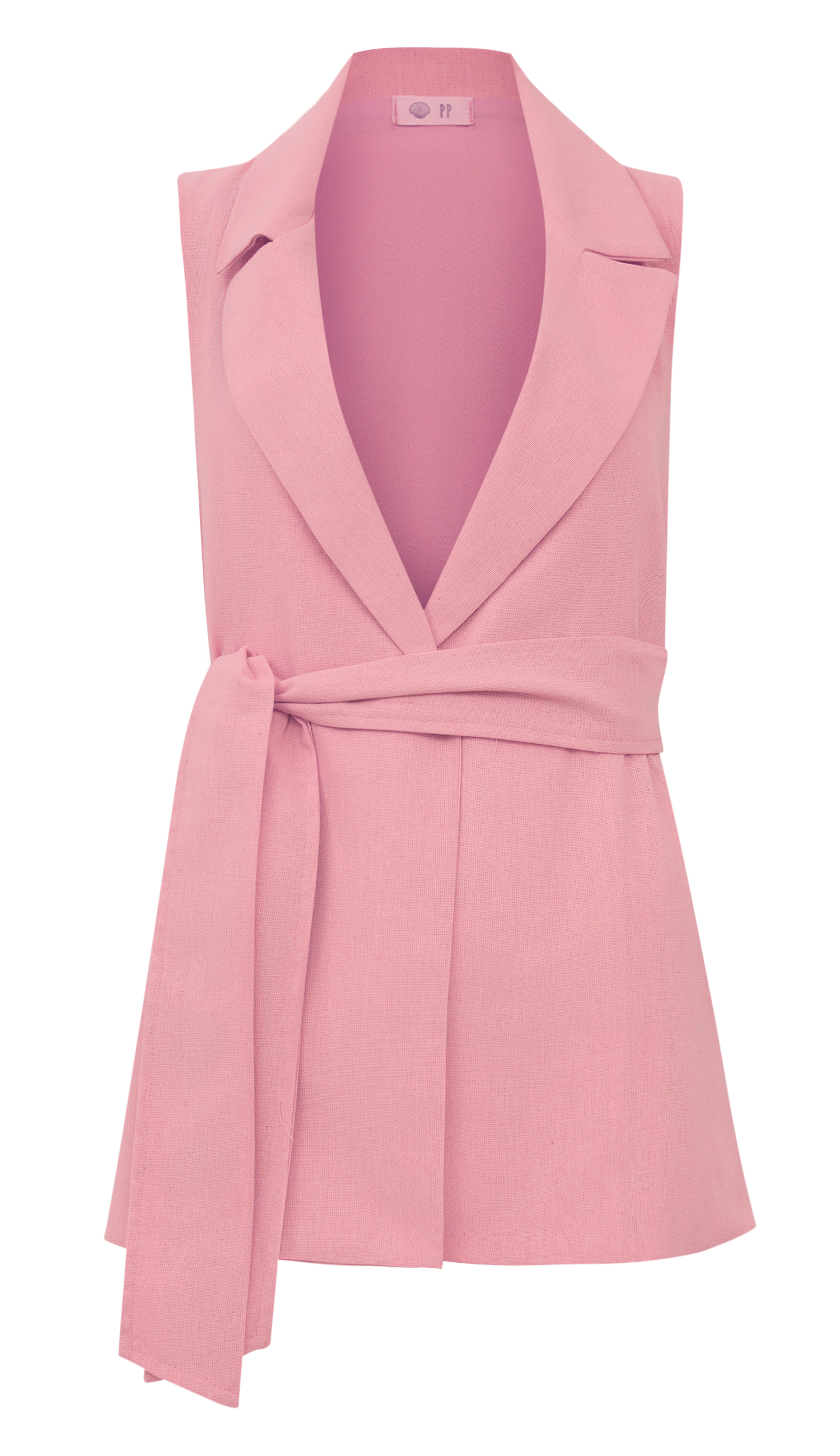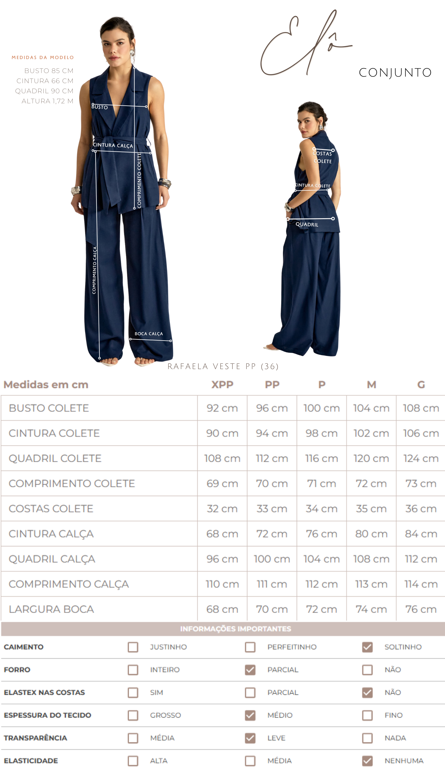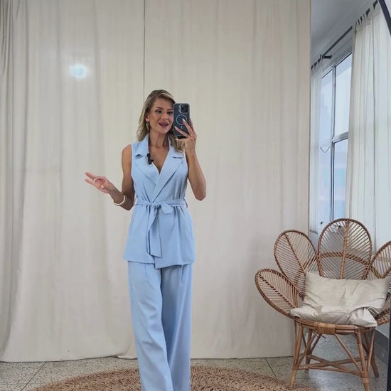 Conjunto confeccionado em linho com forro. O colete é aberto, sem fechamento e possui modelagem alongada e ampla, bolsos laterais, passantes na cintura e faixa solta pespontada para amarrar. A calça é pantalona, possui cós largo, bolsos laterais, pregas frontais e fechamento lateral por zíper invisível.