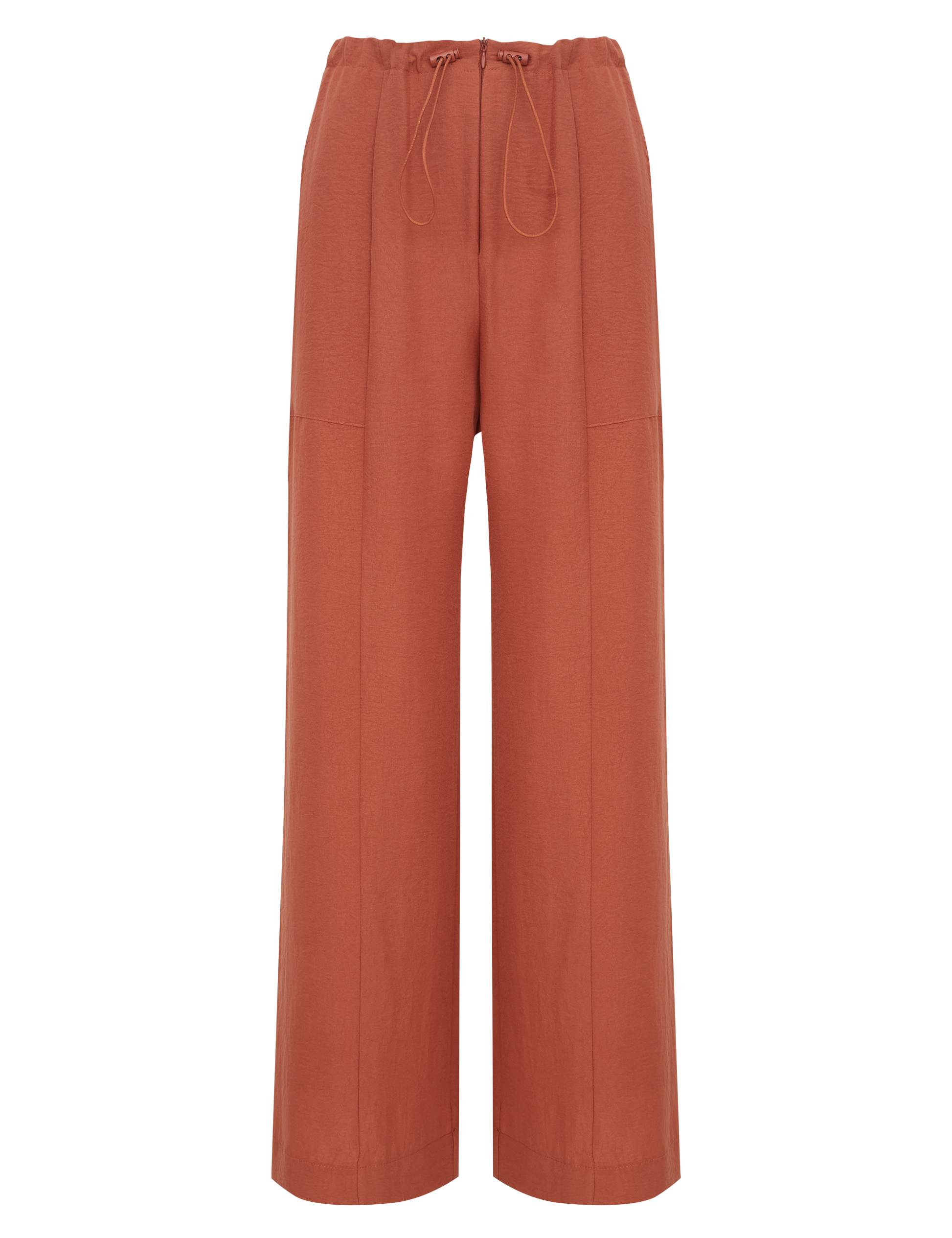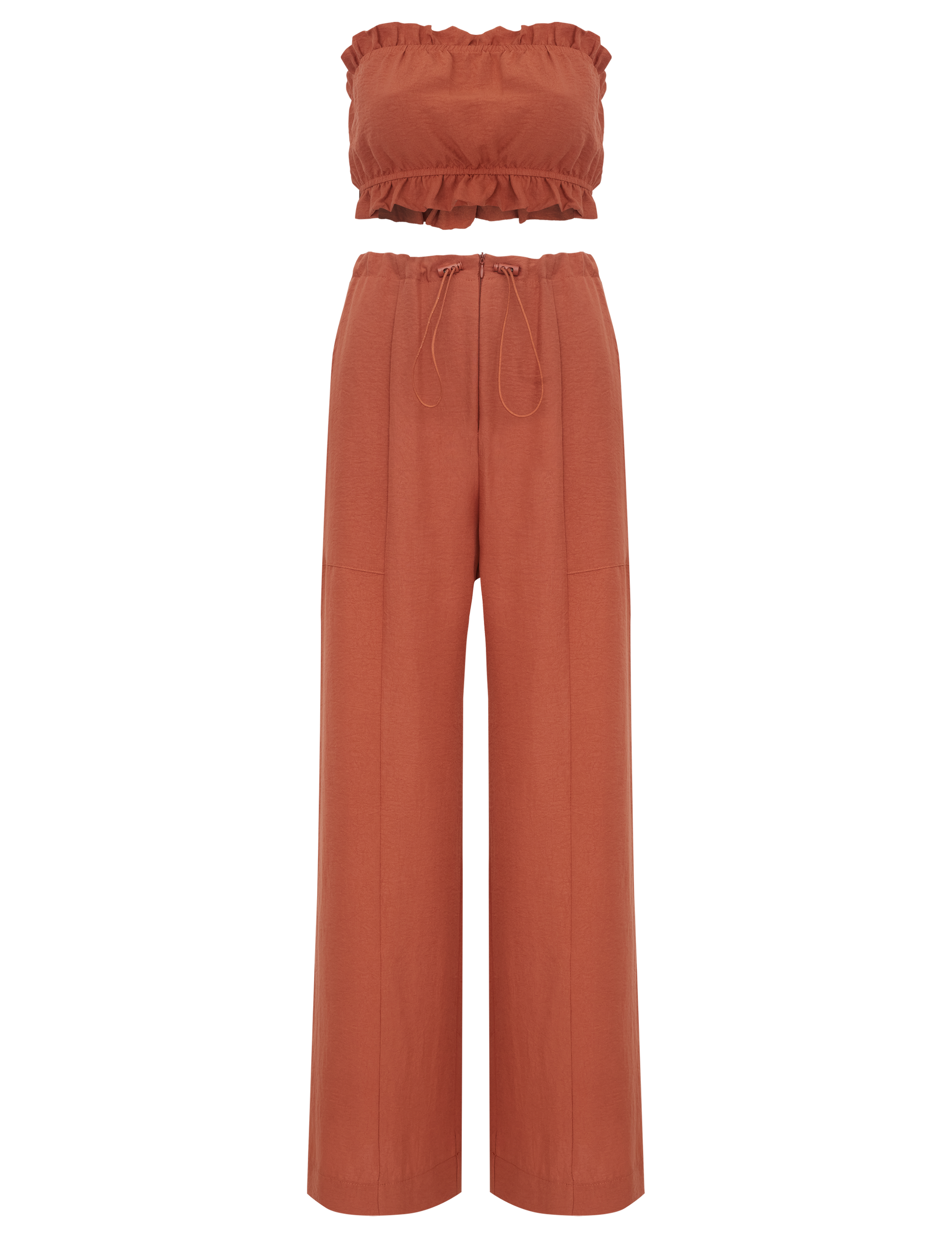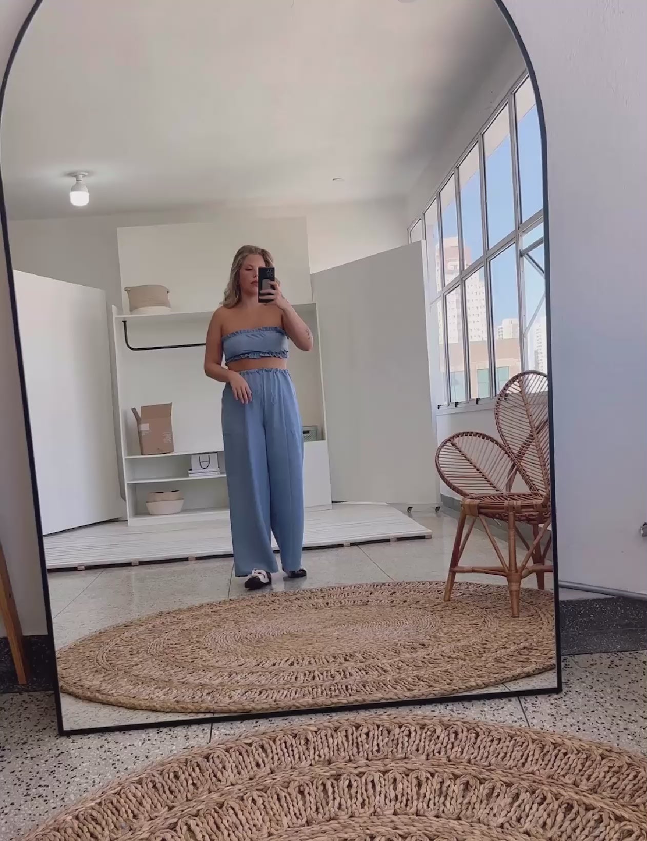 Conjunto confeccionado em poliéster com aspecto de liocel e efeito amassadinho. O top faixa não possui mangas e conta com elástico interno franzido no decote e na barra, para dar sustentação à peça, seguido de babadinhos. A calça wide possui fechamento frontal por zíper invisível, elásticos internos com reguladores para ajuste na frente, bolsos laterais e riscas frontais. Esse tecido garante praticidade e elegância, pois, devido à sua composição, não amassa facilmente e o aspecto de 'tecido nobre' dá um ar sofisticado ao look.